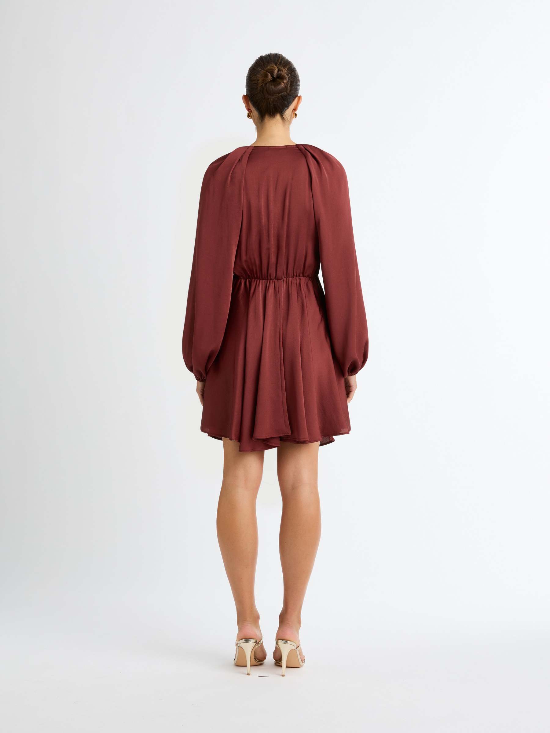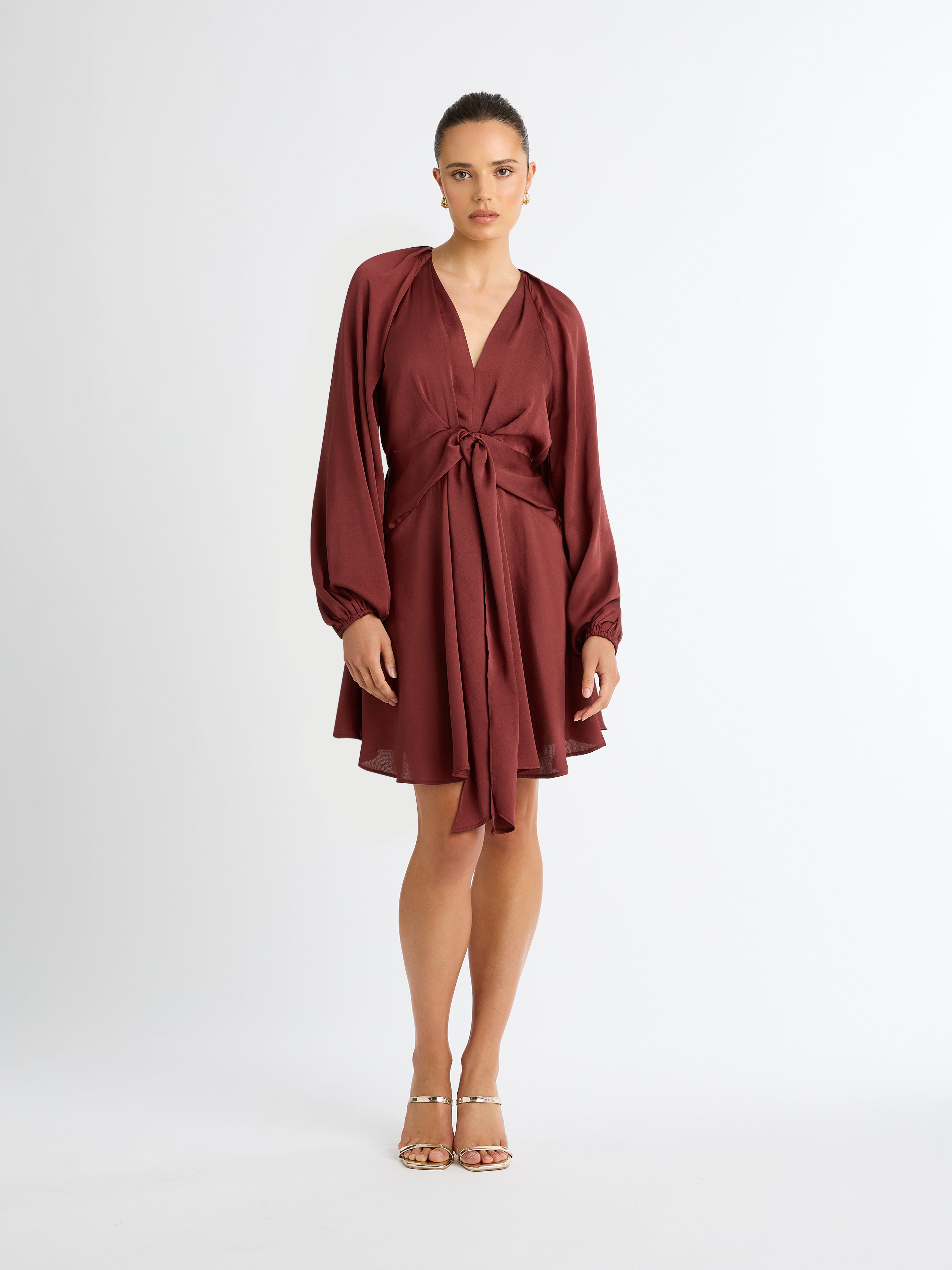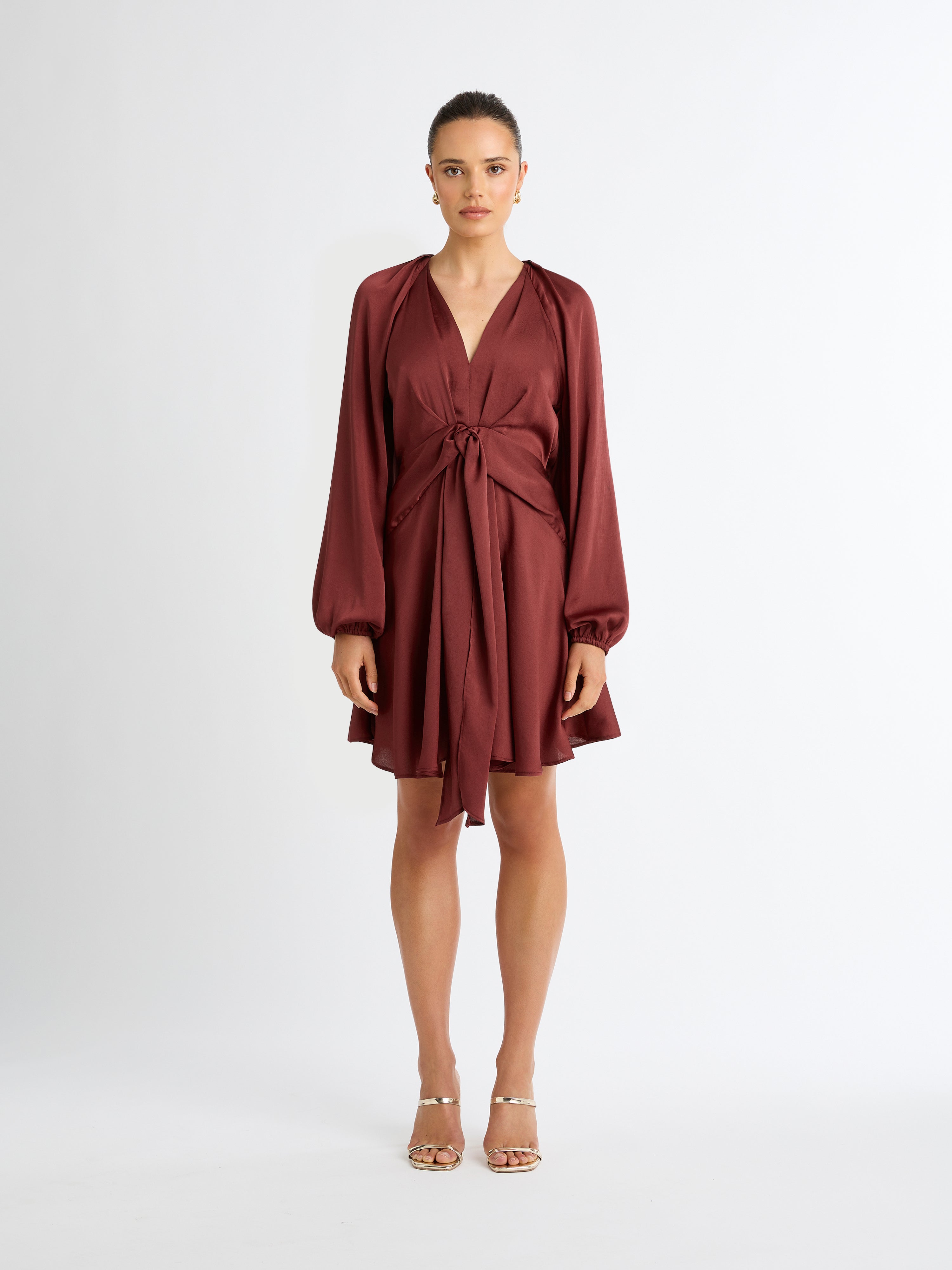 Luxe feminine styling with a timeless design. Our Academy Mini Dress is a wardrobe must have this season. Featuring a satin fabrication, elasticated waist with self fabric tie, flared mini skirt and long sleeves with elasticated cuffs. Style with our Tamsin Earrings to complete the look.