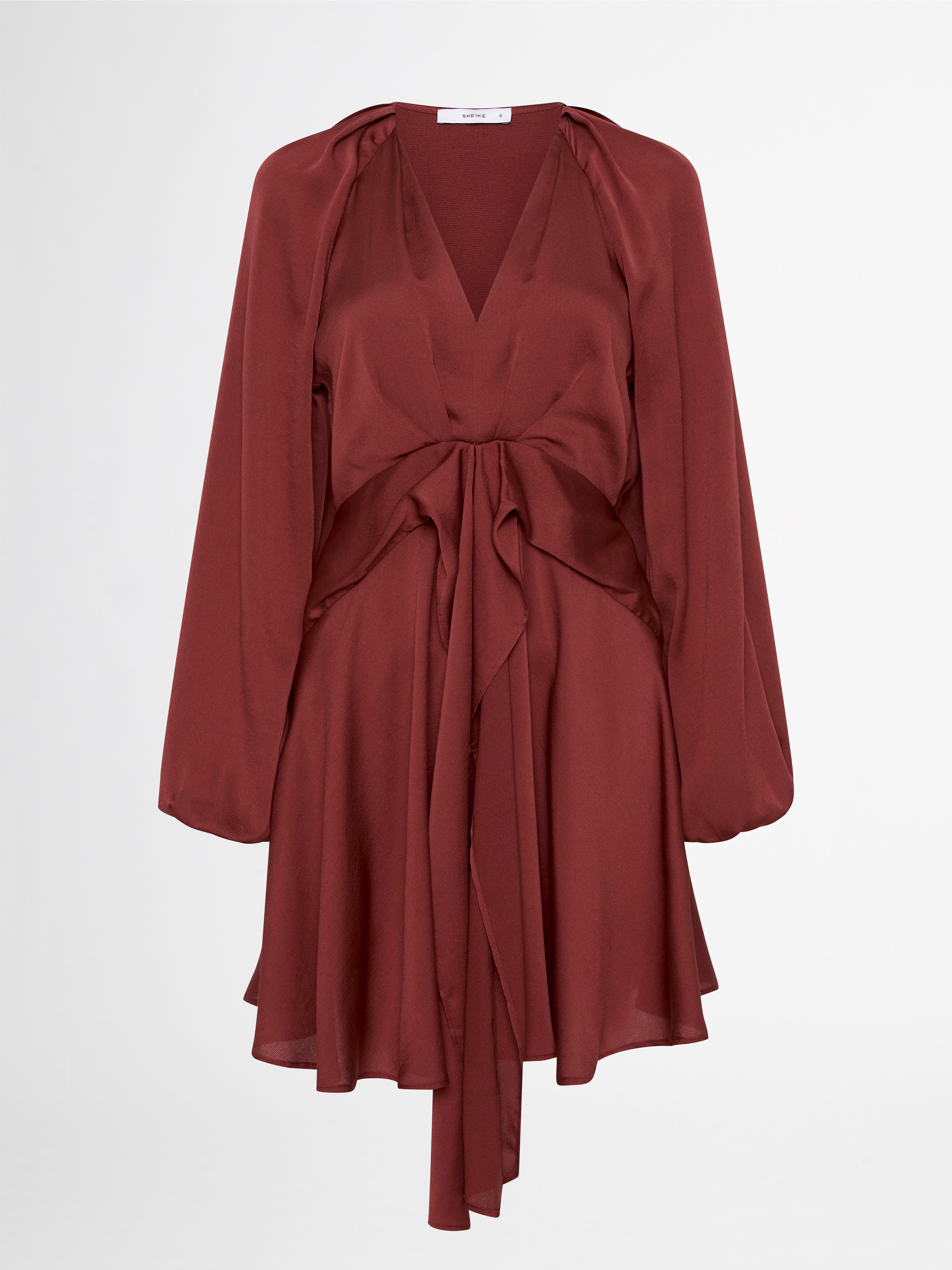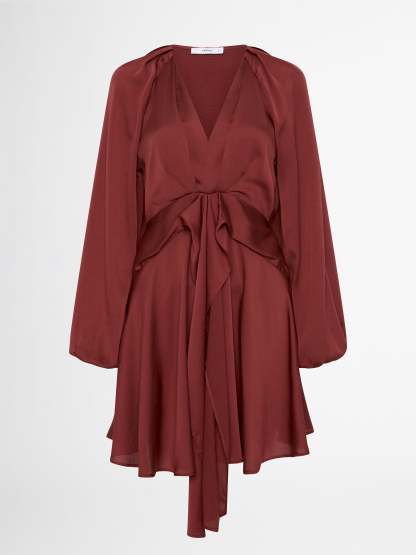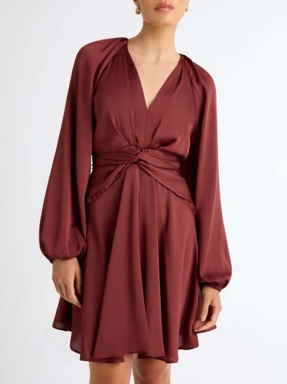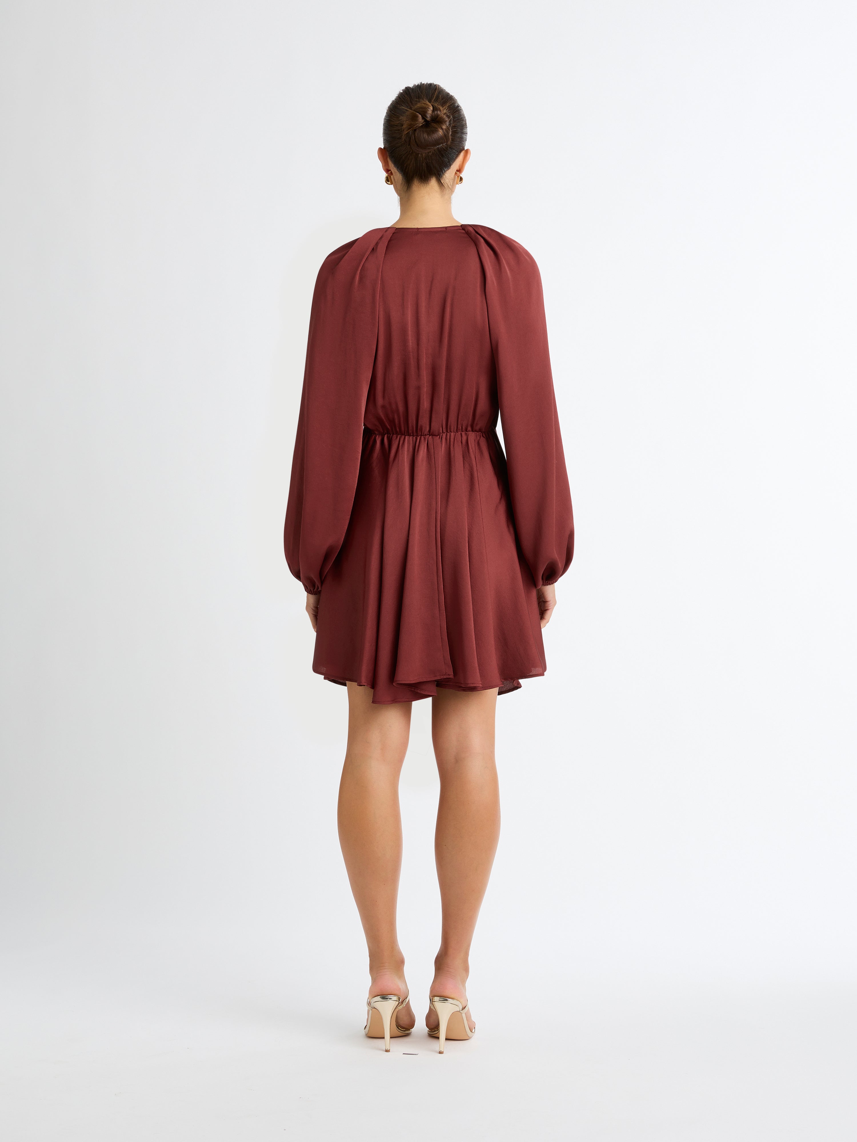 Luxe feminine styling with a timeless design. Our Academy Mini Dress is a wardrobe must have this season. Featuring a satin fabrication, elasticated waist with self fabric tie, flared mini skirt and long sleeves with elasticated cuffs. Style with our Tamsin Earrings to complete the look.