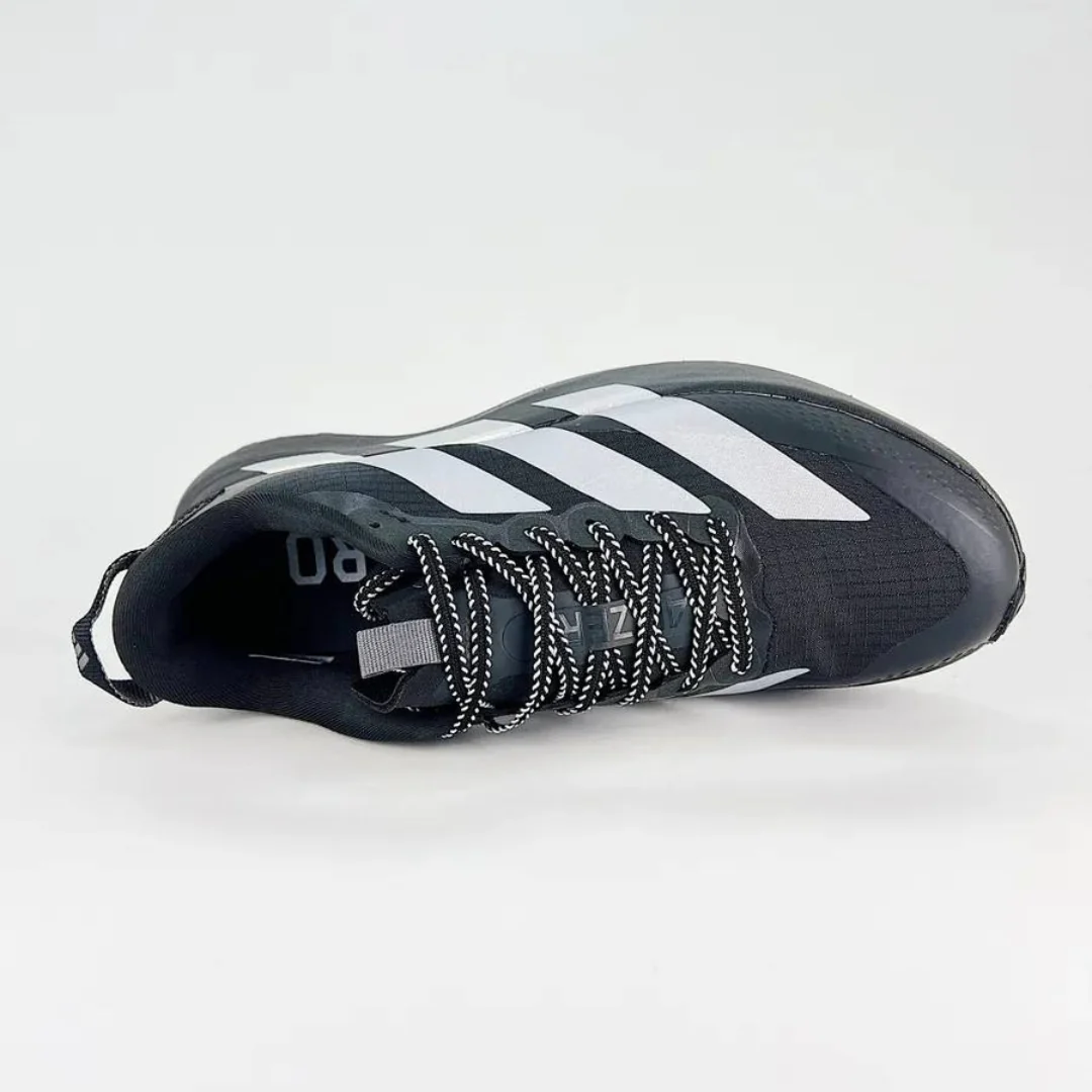 Esses tênis de modelagem padrão têm tecido malha elástica ripstop e um protetor contra lama que proporciona repelência à água e proteção contra os elementos, enquanto a assinatura ADIZERO sling launch oferece fechamento do calcanhar adicional.