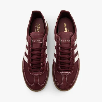 Joining forces once more, the adidas Originals x Sporty & Rich Handball Spezial "Sharp Red" elevates decades of heritage with modern sensibilities. This low-profile silhouette is crafted with a suede upper, tonal hairy suede overlays cover the T-toe and heel. Contrast stitching joins hits of white at the lacing and serrated Three Stripes details, while gold text accents the sidewall. A gum rubber outsole offers durability and grip while completing the vintage look.
