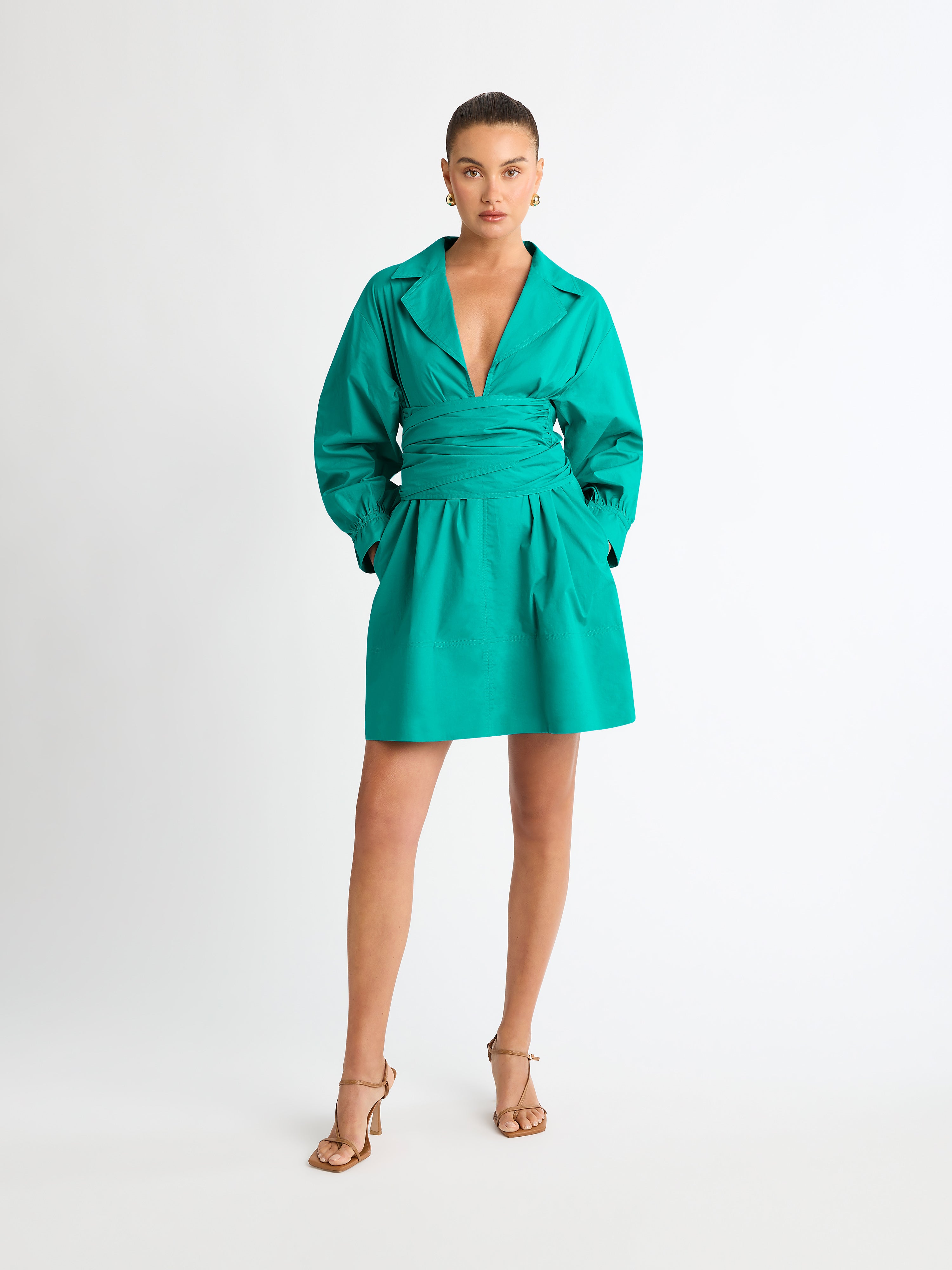Introducing the Aluna Mini Dress – a captivating blend of contemporary chic and timeless allure. Elevate your wardrobe with this versatile piece that effortlessly transitions from day to night, ensuring you stand out with confidence. Showcasing 100% Cotton fabrication, collar neckline, long sleeve, wide belt to be tied two ways and mini skirt with side seam pockets. Pair with our Sphere Stud Earrings to complete the look.