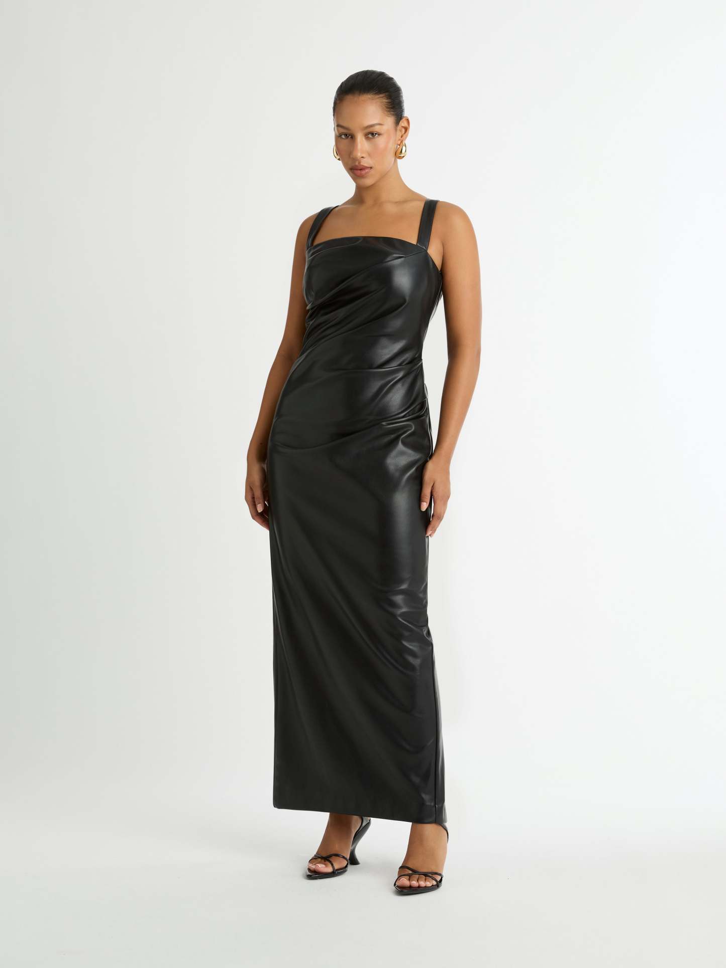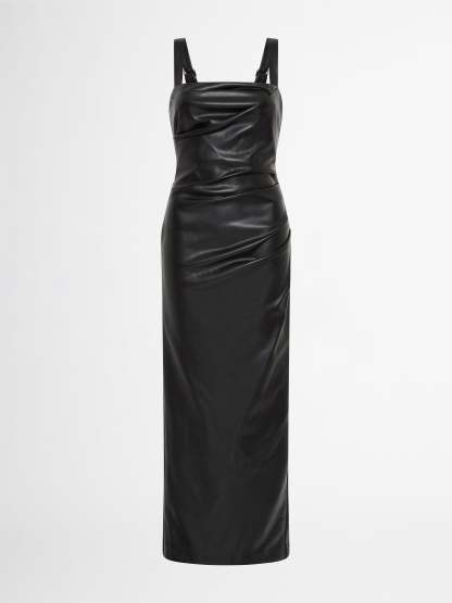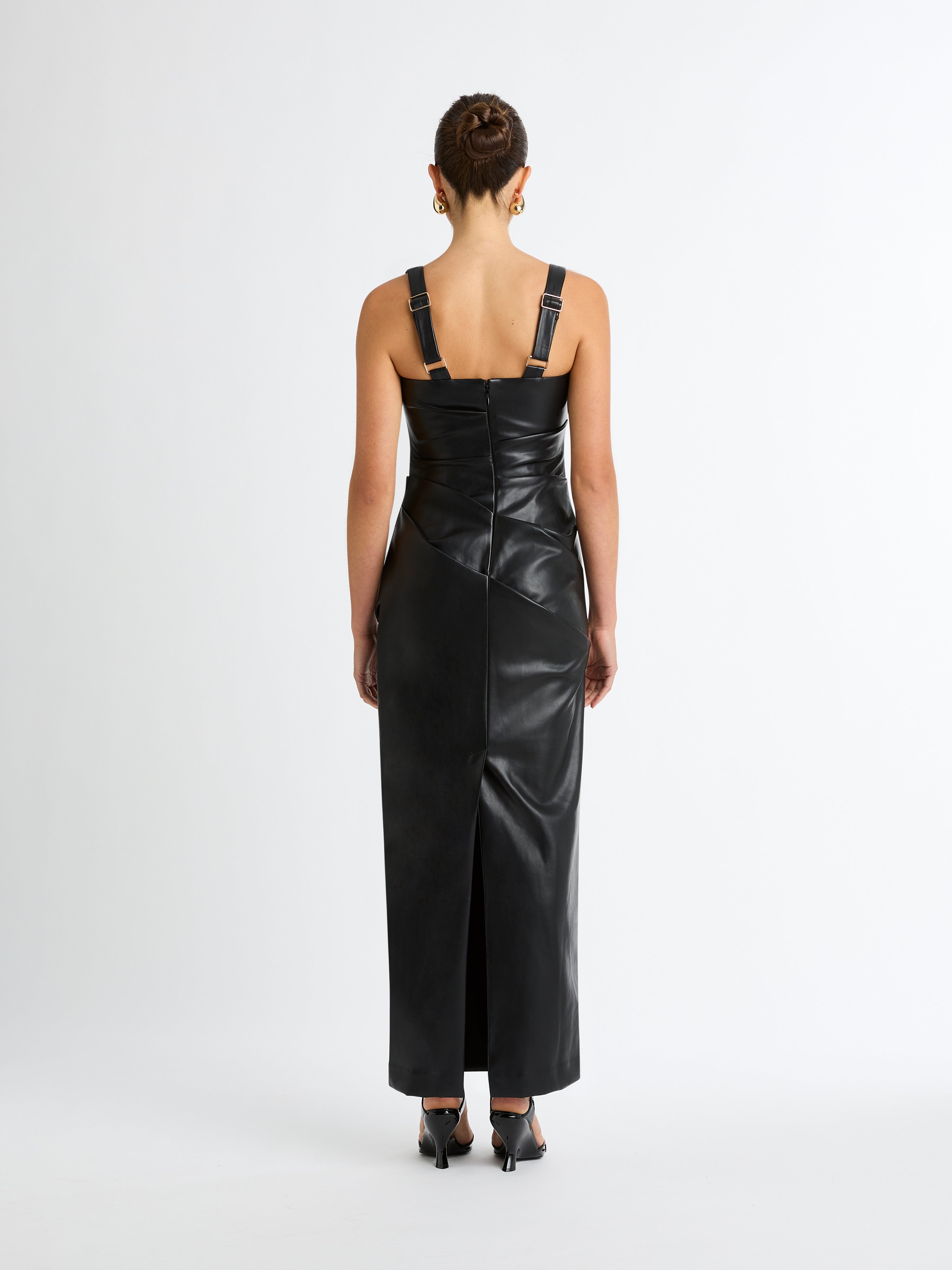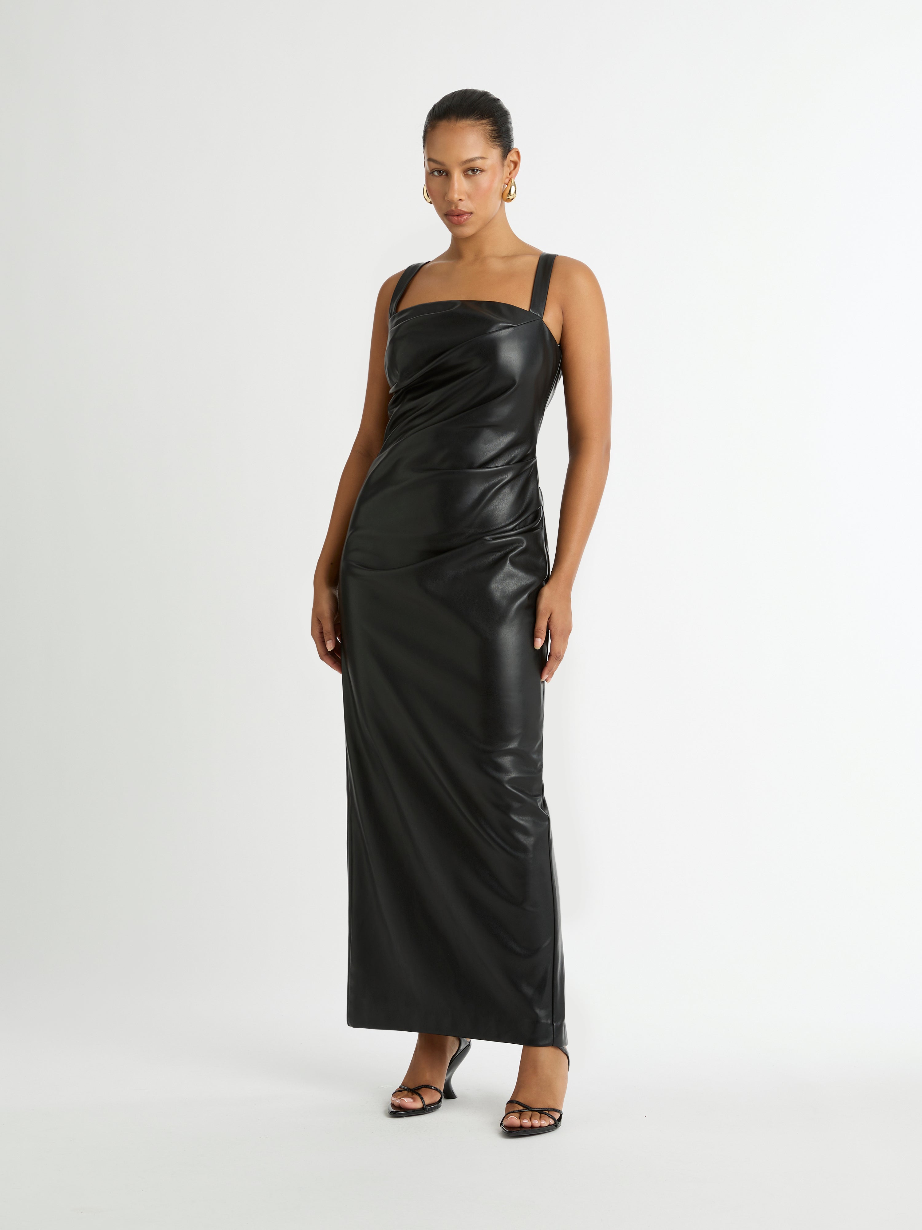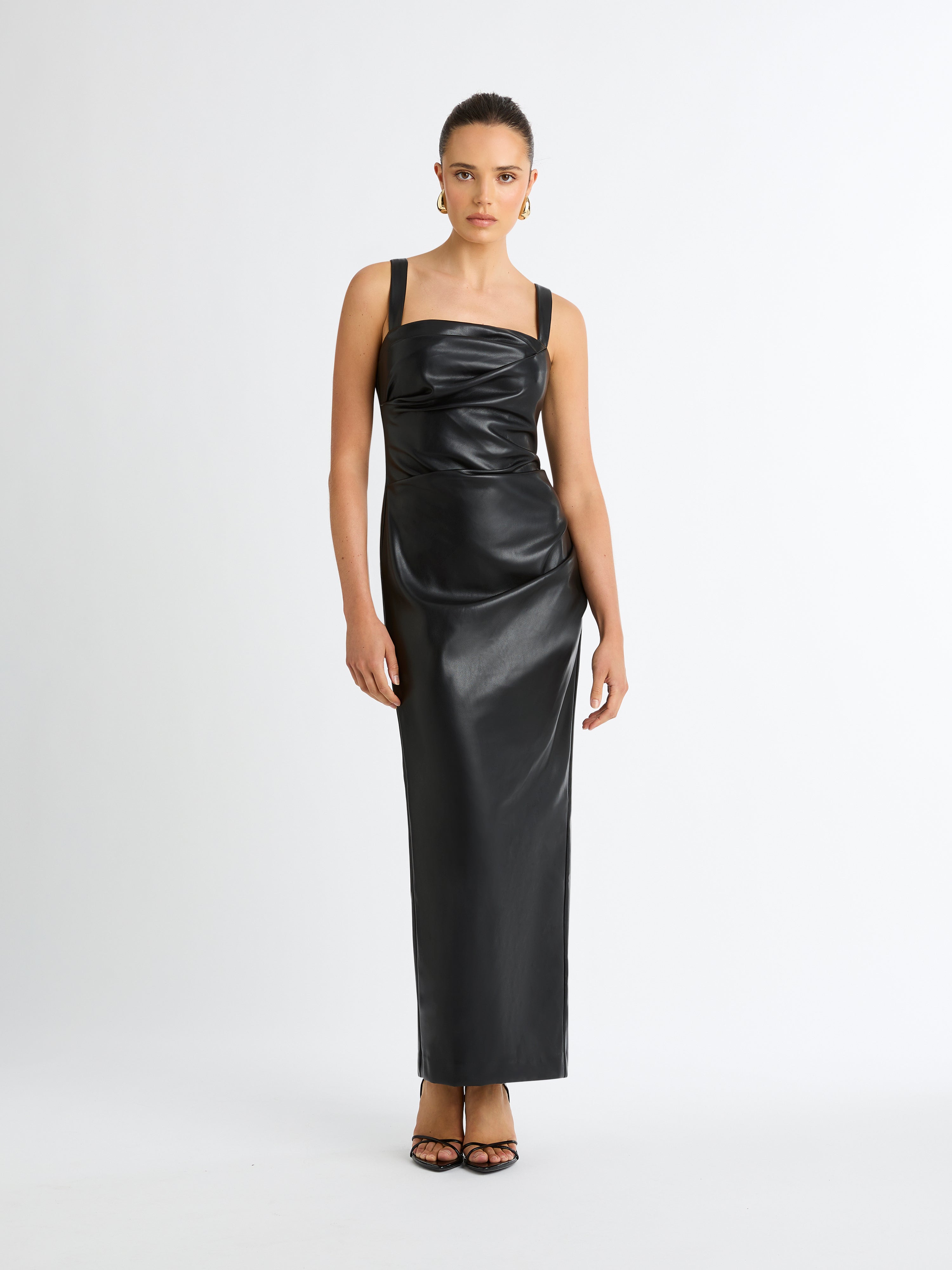 An effortlessly polished look for any occasion. Introducing the Amsterdam Maxi Dress - showcasing a PU Faux Leather fabrication, fitted cut, thick adjustable straps, side seam and bodice pleats and a maxi length. Pair with our Manhattan Earrings to complete the look.