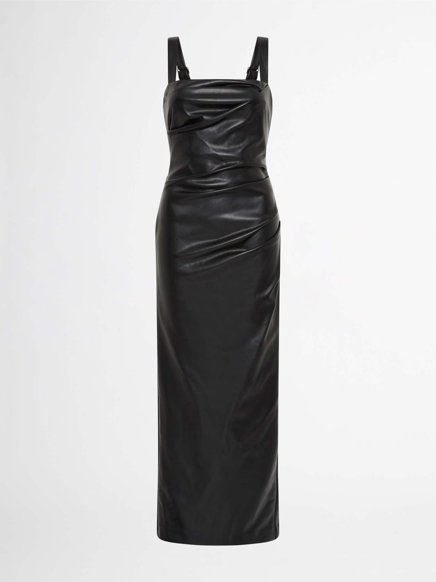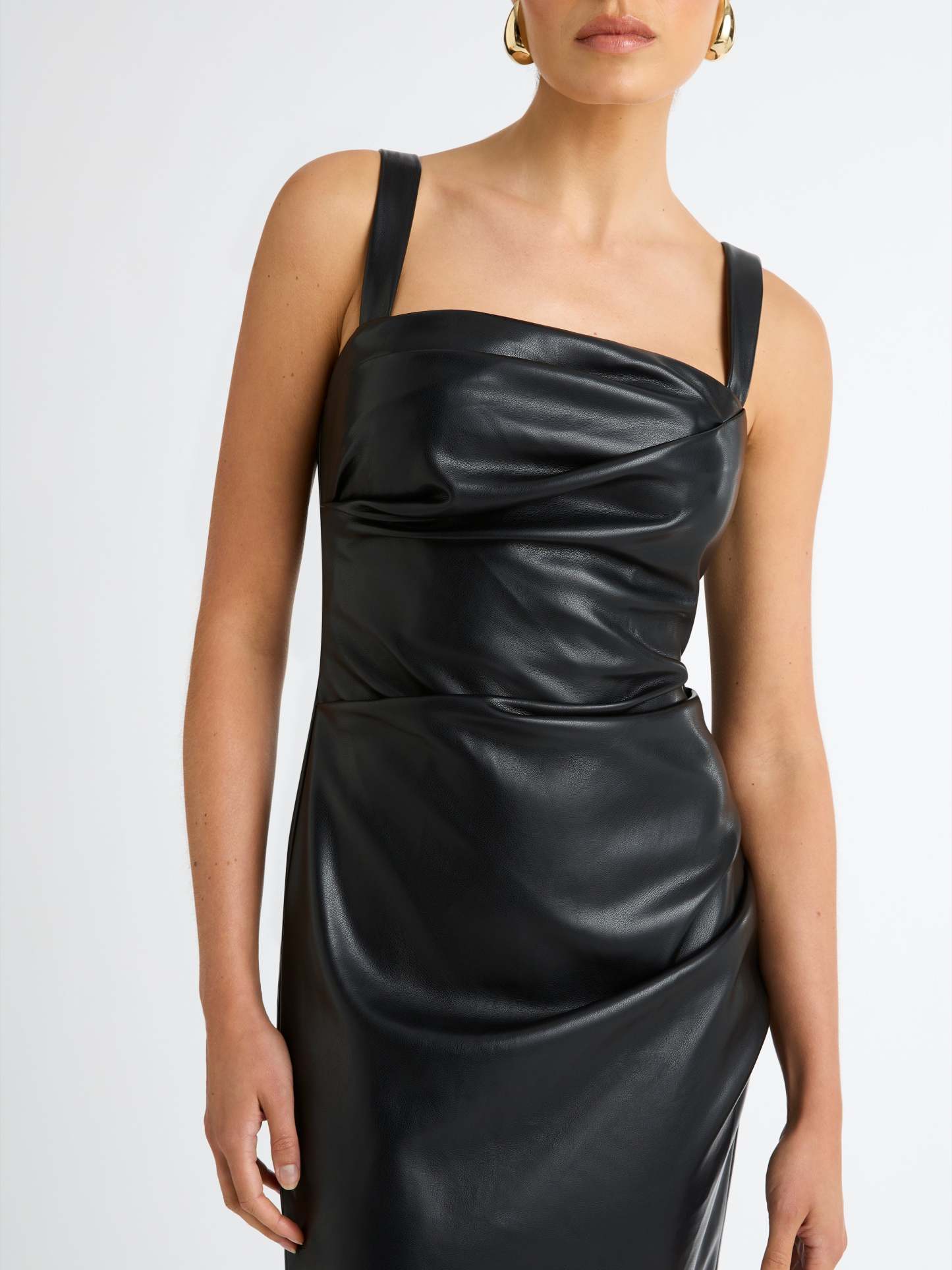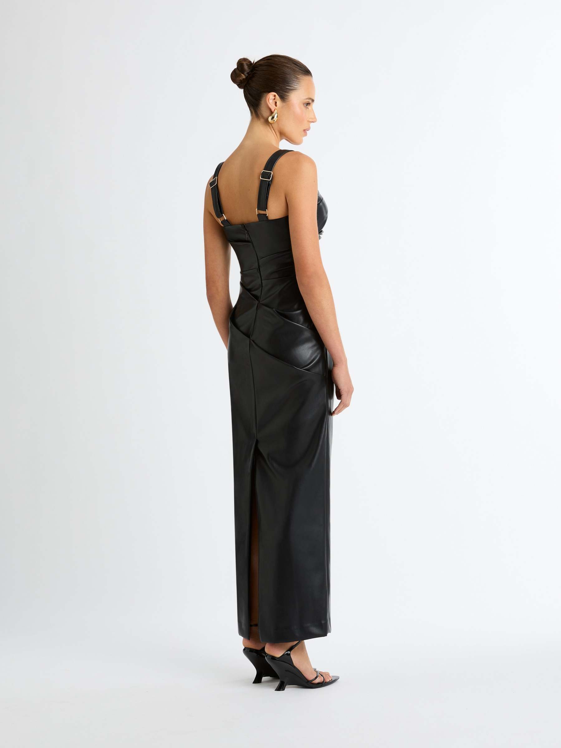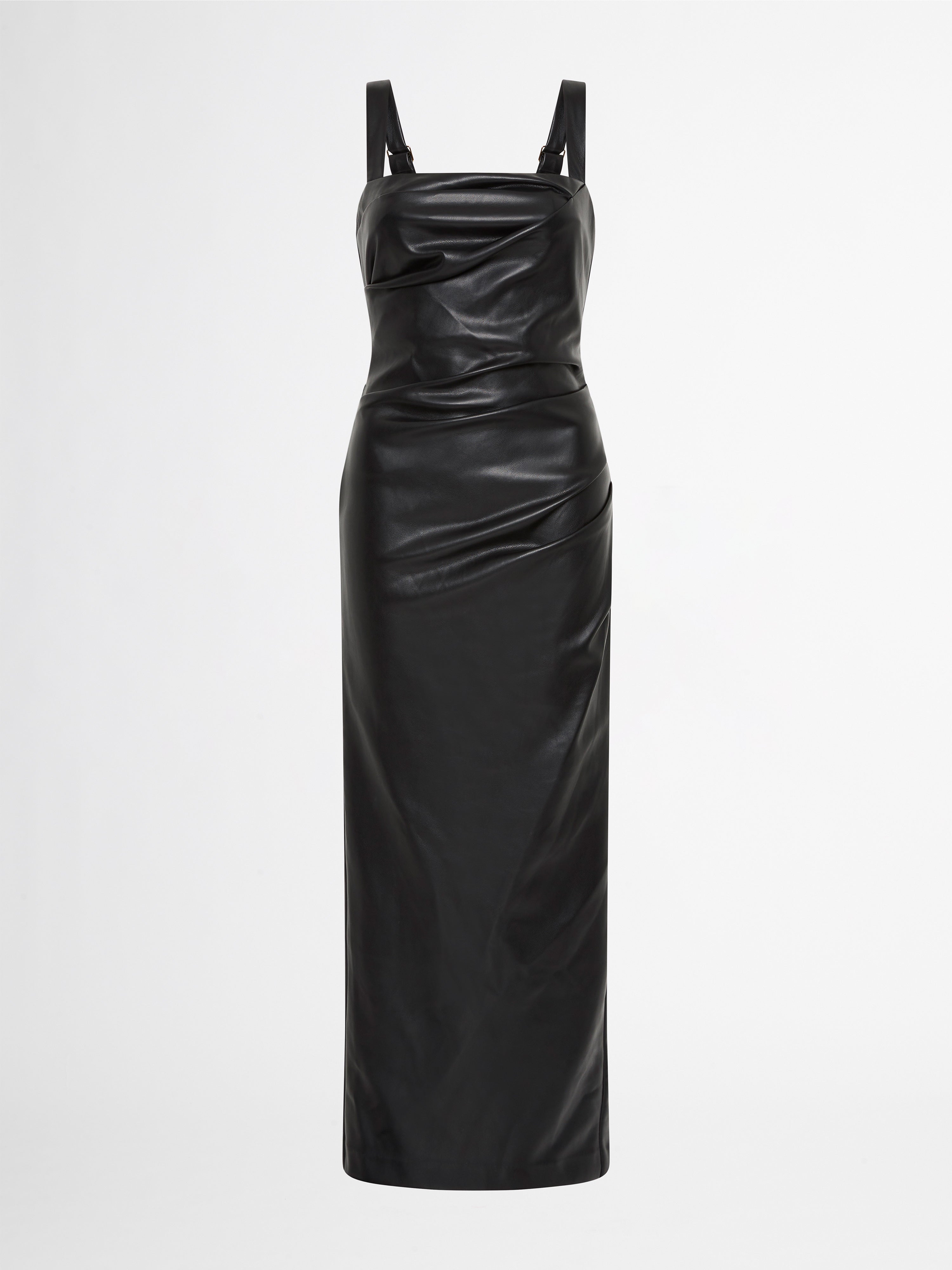 An effortlessly polished look for any occasion. Introducing the Amsterdam Maxi Dress - showcasing a PU Faux Leather fabrication, fitted cut, thick adjustable straps, side seam and bodice pleats and a maxi length. Pair with our Manhattan Earrings to complete the look.