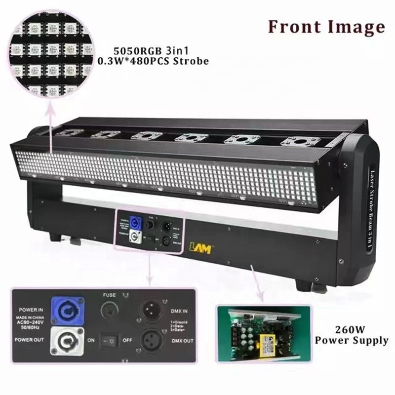 Esta exclusiva luz con cabezal mA3vil integra LA?SER BEAM LED BEAM/WASH LED STROBE tres en uno.A?Utiliza una fuente lA!ser R500Mw * 6 piezas para proporcionar un efecto de haz perfectamente nA-tido. LED CREE de 5 W * 8 piezas para proporcionar un hermoso haz A!mbar saturado y efecto de teA??ido. y LED RGB 3 en 1 de 0.3 W * 480 piezas para proporcionar una luz de funcionamiento sin parpadeos y un efecto estroboscA3pico.