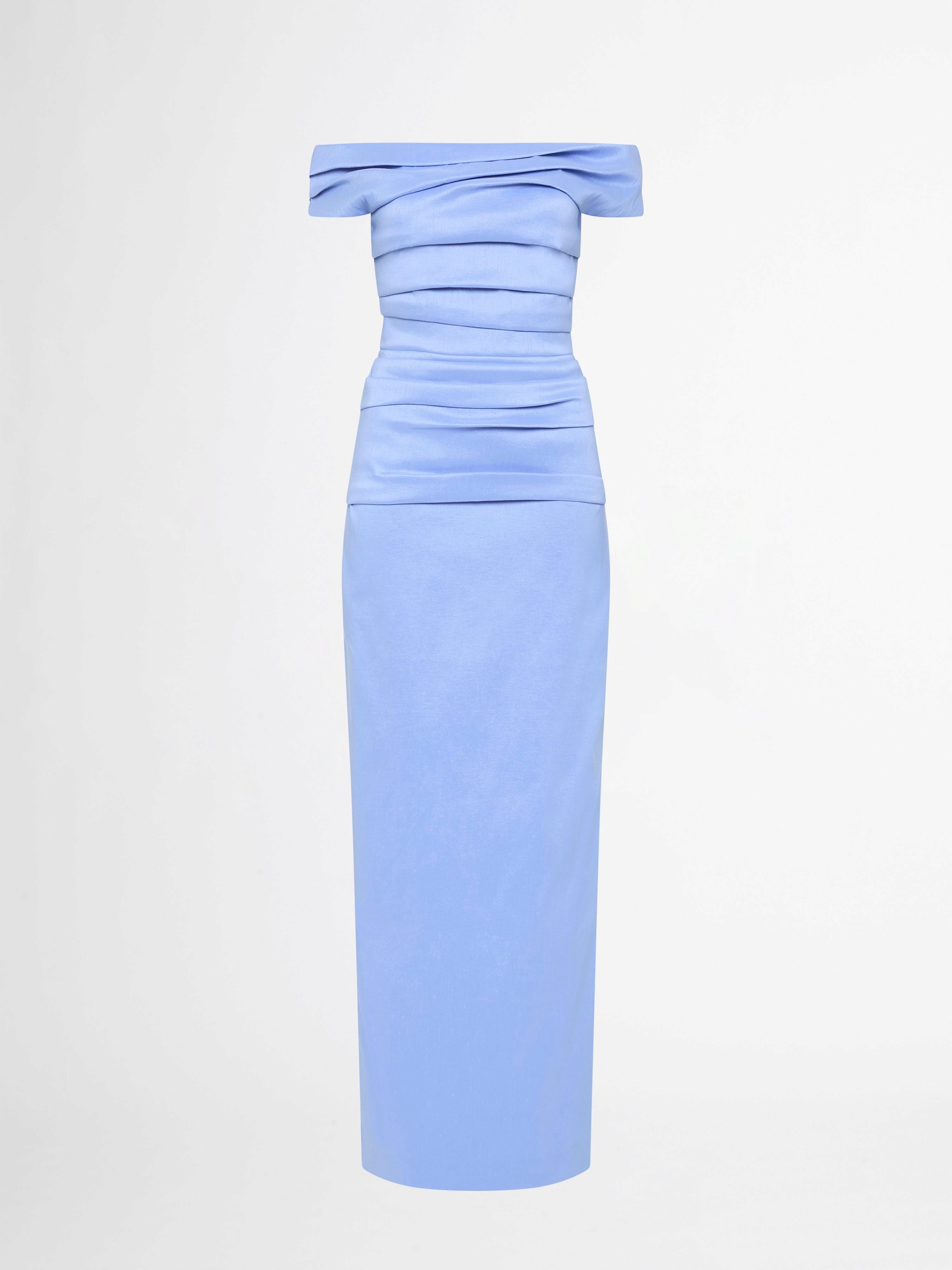Designed to honour the shape of the female form. Introducing the Elissa Gown - showcasing a fitted styling, stretch taffeta fabrication, off shoulder straps, pleating throughout dress, side seam split and invisible center back zipper. Pair with our Blake Ear Cuff to complete the look.