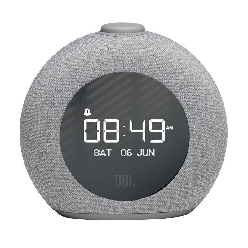 Wake up to JBL Pro Sound. With its signature round design, ambient LED light and DAB/DAB+/FM radio, JBL Horizon 2 completes any bedroom. A large LCD display clearly shows the time, alarm clock settings and radio info, while the lifestyle fabric cover blends perfectly with any decor. Choose from a selection of alarm tones or one of your favourite DAB, DAB+ or FM radio stations. The easy-to-use rotary control knob lets you set and snooze alarms, adjust the volume or turn the ambient light on and off. Complete with two convenient USB ports for charging your devices and BluetoothR connectivity to your favourite tunes, JBL Horizon 2 is the perfect bedside companion.