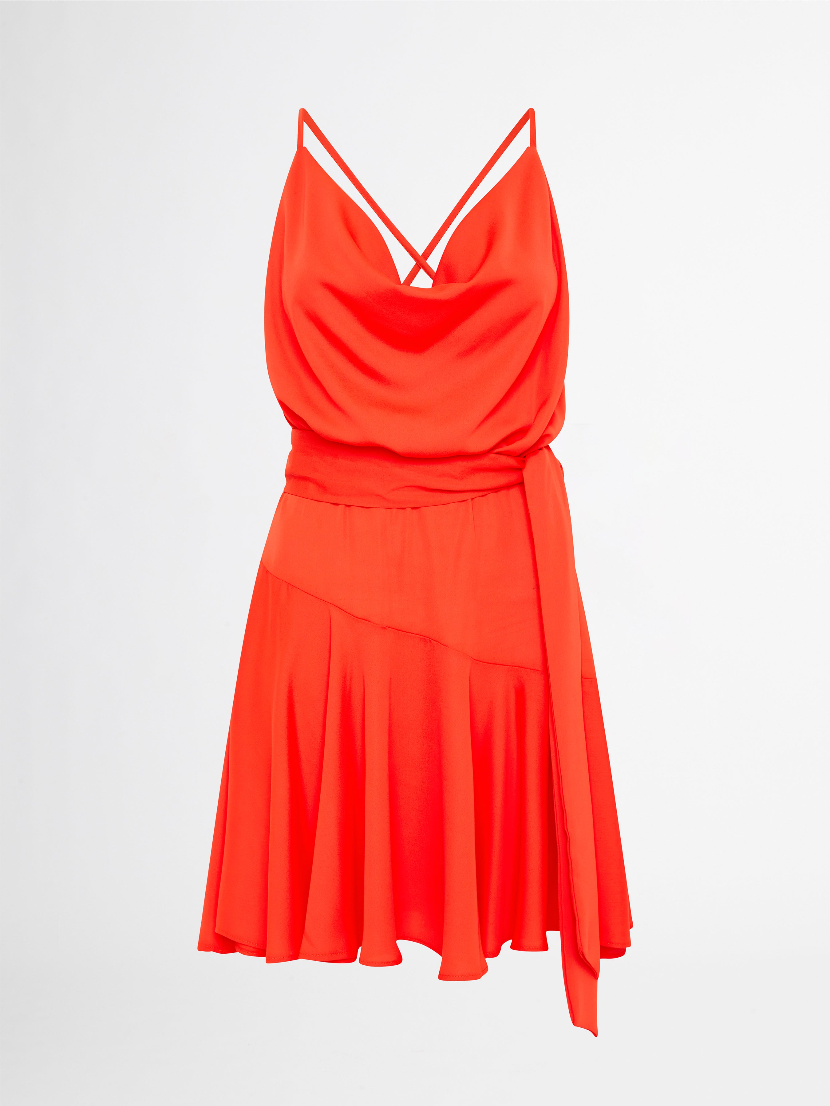 ~section~Satin woven fabricationAsymmetric cowl neckline with draping on one strap and thin strap on the otherAdjustable strapsMini circle skirtElasticated back waistMatching waist tie100% PolyesterCold gentle machine wash Style: 1005973