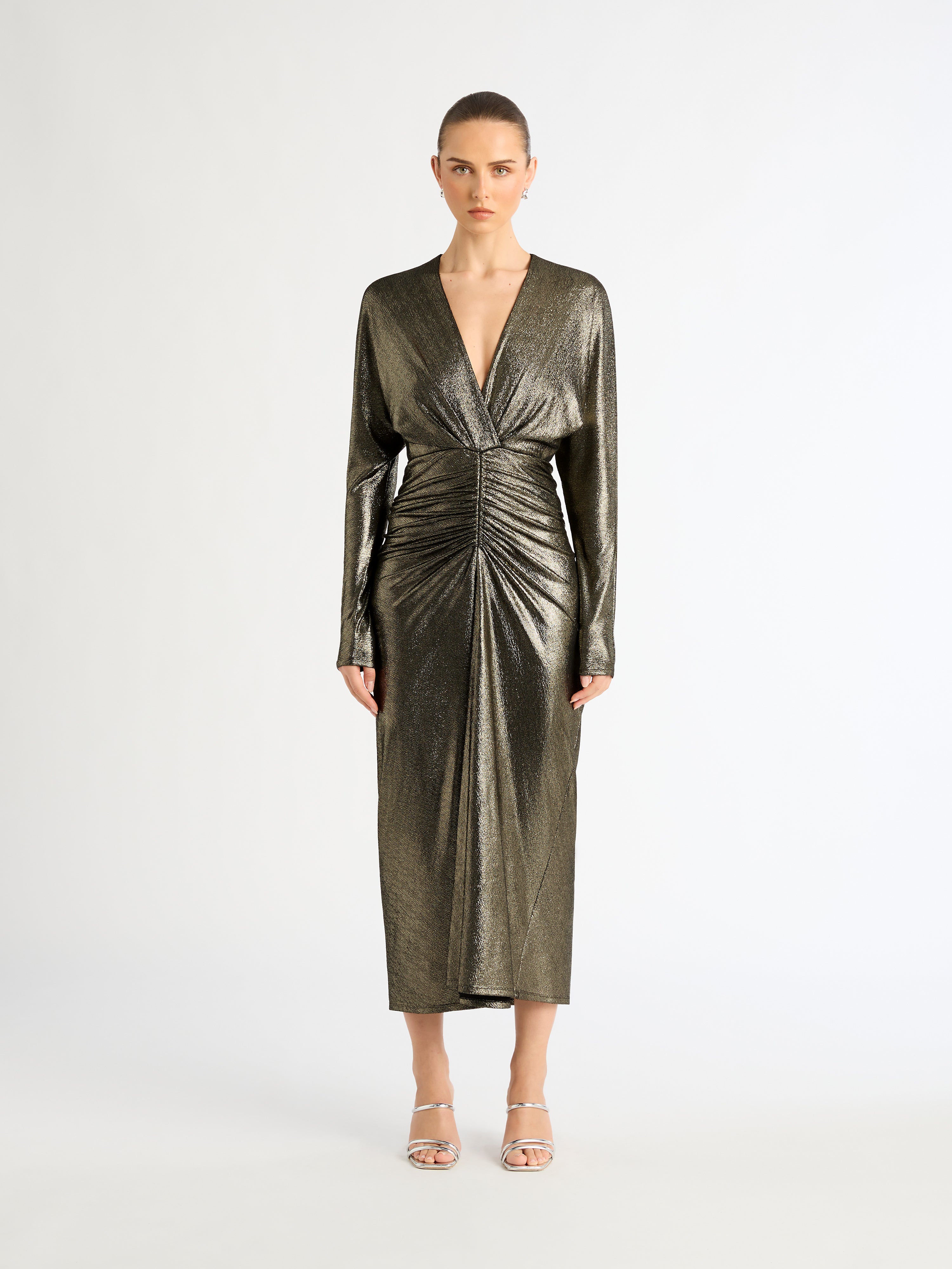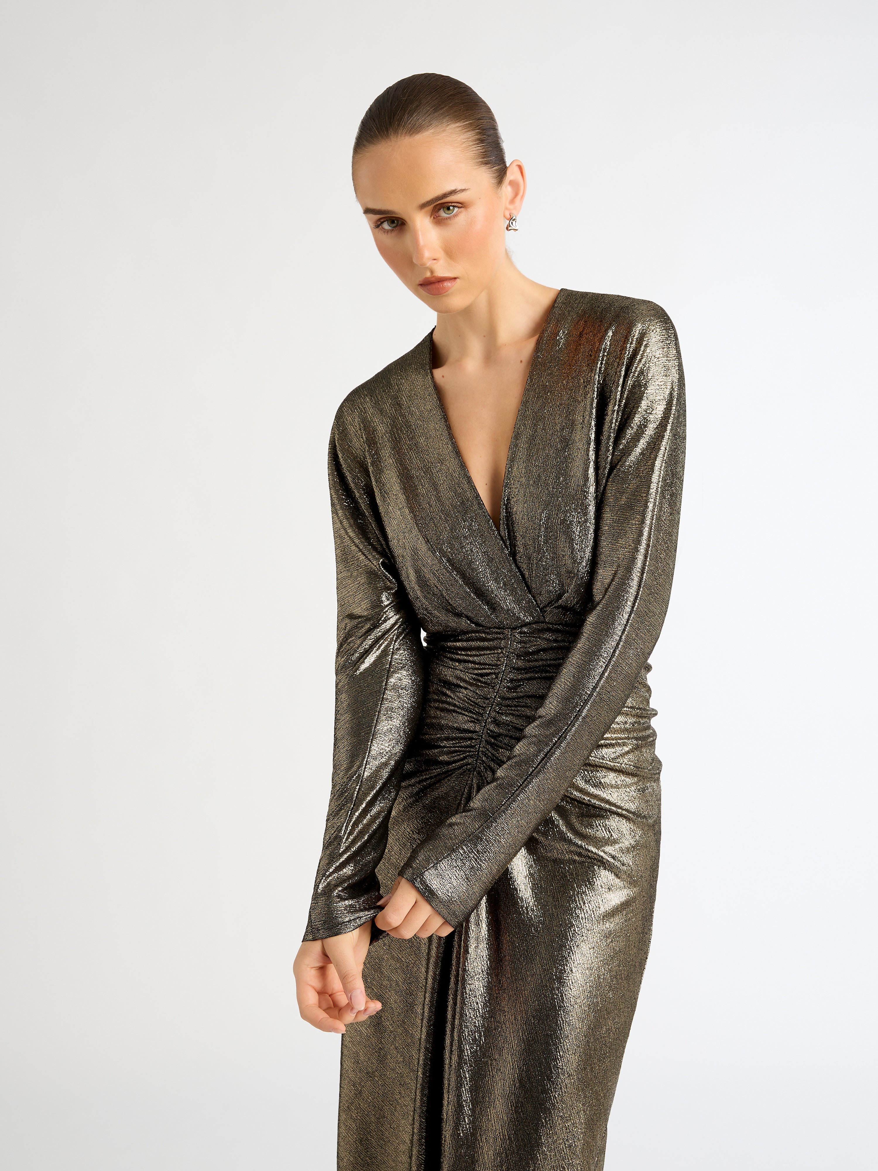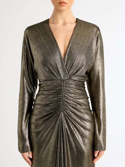Stunning gold sparkles and a silhouette to flatter. Introducing our Manhattan Dress- featuring a metallic finish fabrication, long sleeves, V neckline, midi length skirt and ruching at center front waist. Pair back with our Montana Earrings for an evening fit.