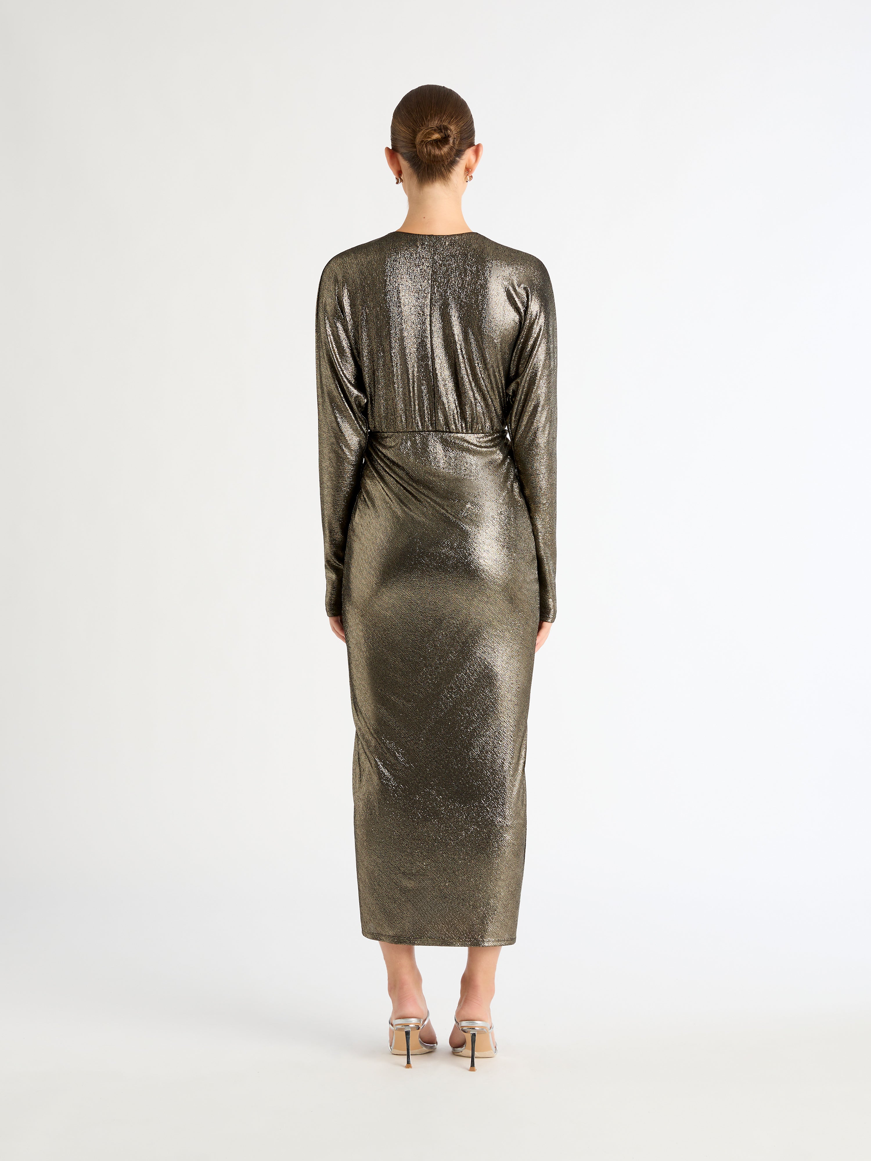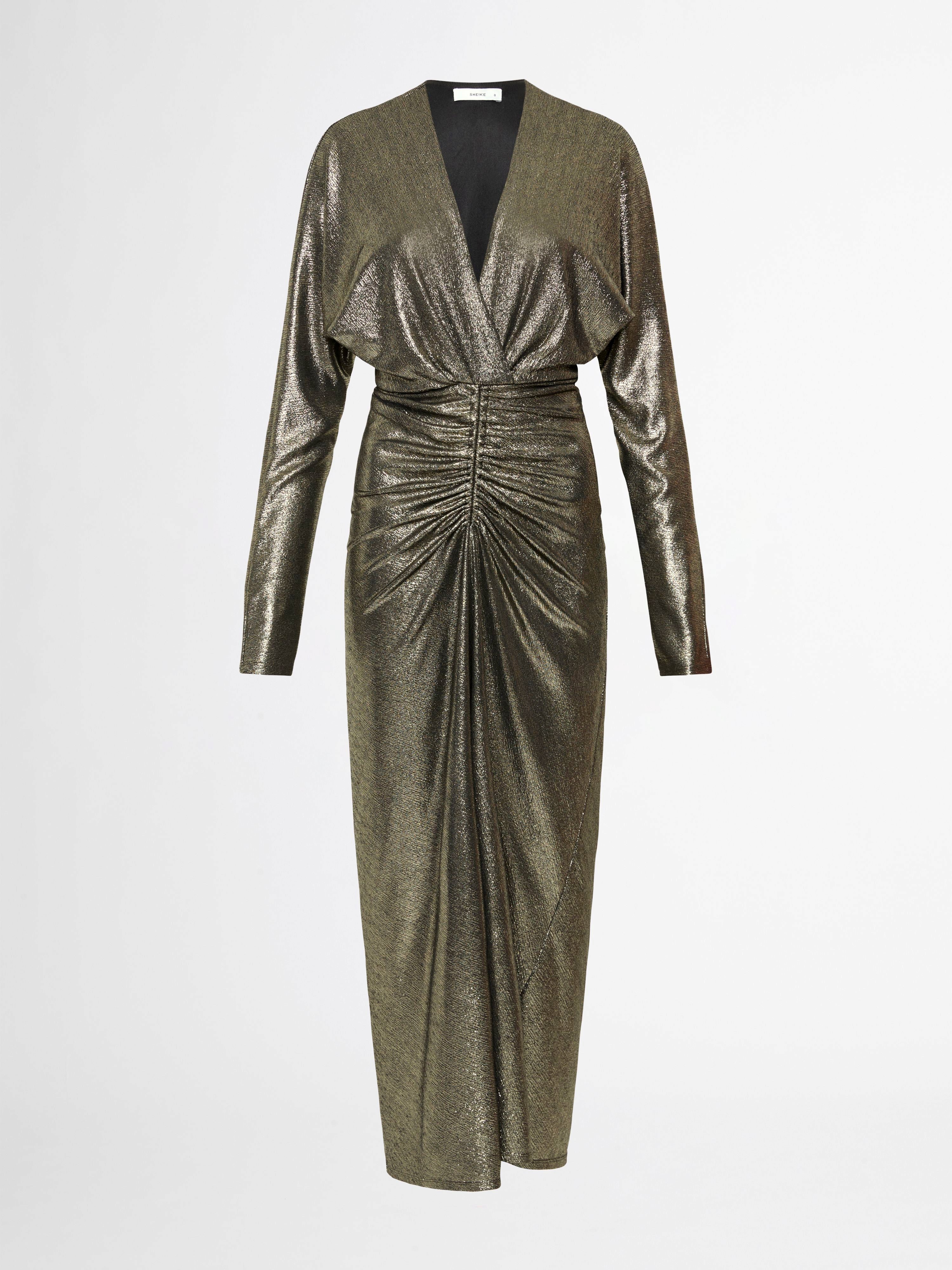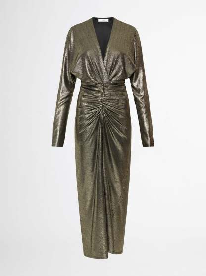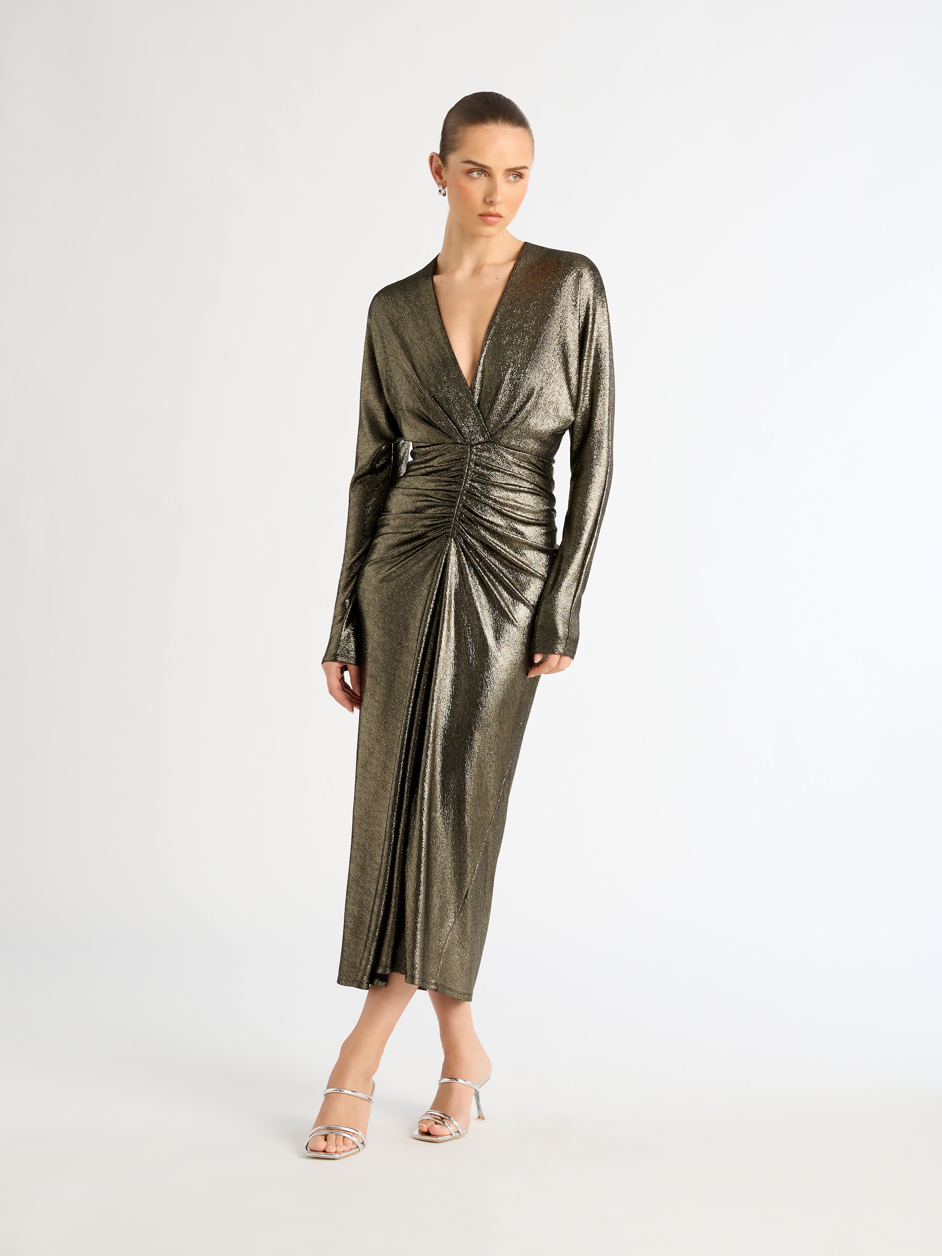 Stunning gold sparkles and a silhouette to flatter. Introducing our Manhattan Dress- featuring a metallic finish fabrication, long sleeves, V neckline, midi length skirt and ruching at center front waist. Pair back with our Montana Earrings for an evening fit.