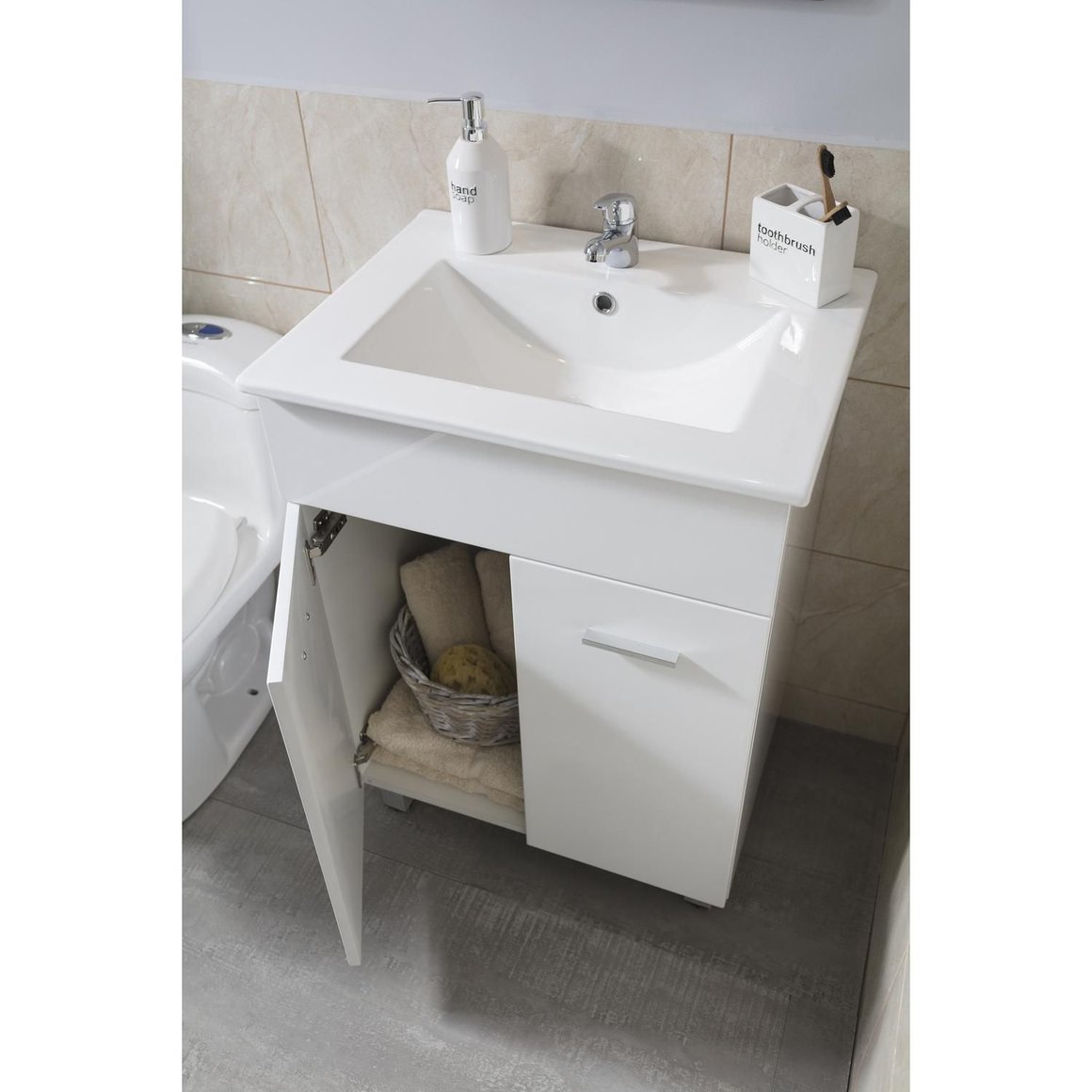 Dale a tu baño un toque de elegancia y funcionalidad con el mueble Abrantes color blanco. Su diseño moderno y práctico te ayudará a mantener el orden en tu espacio, mientras que su material de melamina te asegura durabilidad y resistencia. Con dos puertas que ofrecen un cierre suave, podrás guardar tus artículos de baño con facilidad y discreción. Además, incluye un lavamanos de cerámica que le da un toque sofisticado a tu baño.