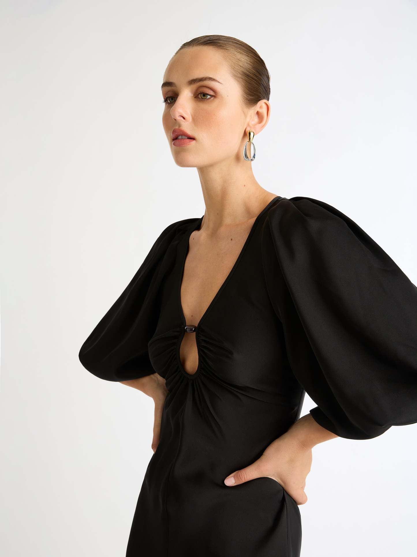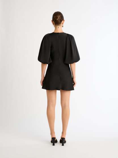 The Party season essential - Introducing the Petra Mini Dress. Showcasing satin woven fabrication, mini skirt length, balloon sleeves and cut out at the bust with bead detailing. Pair with our Natascha Earrings to complete the look.