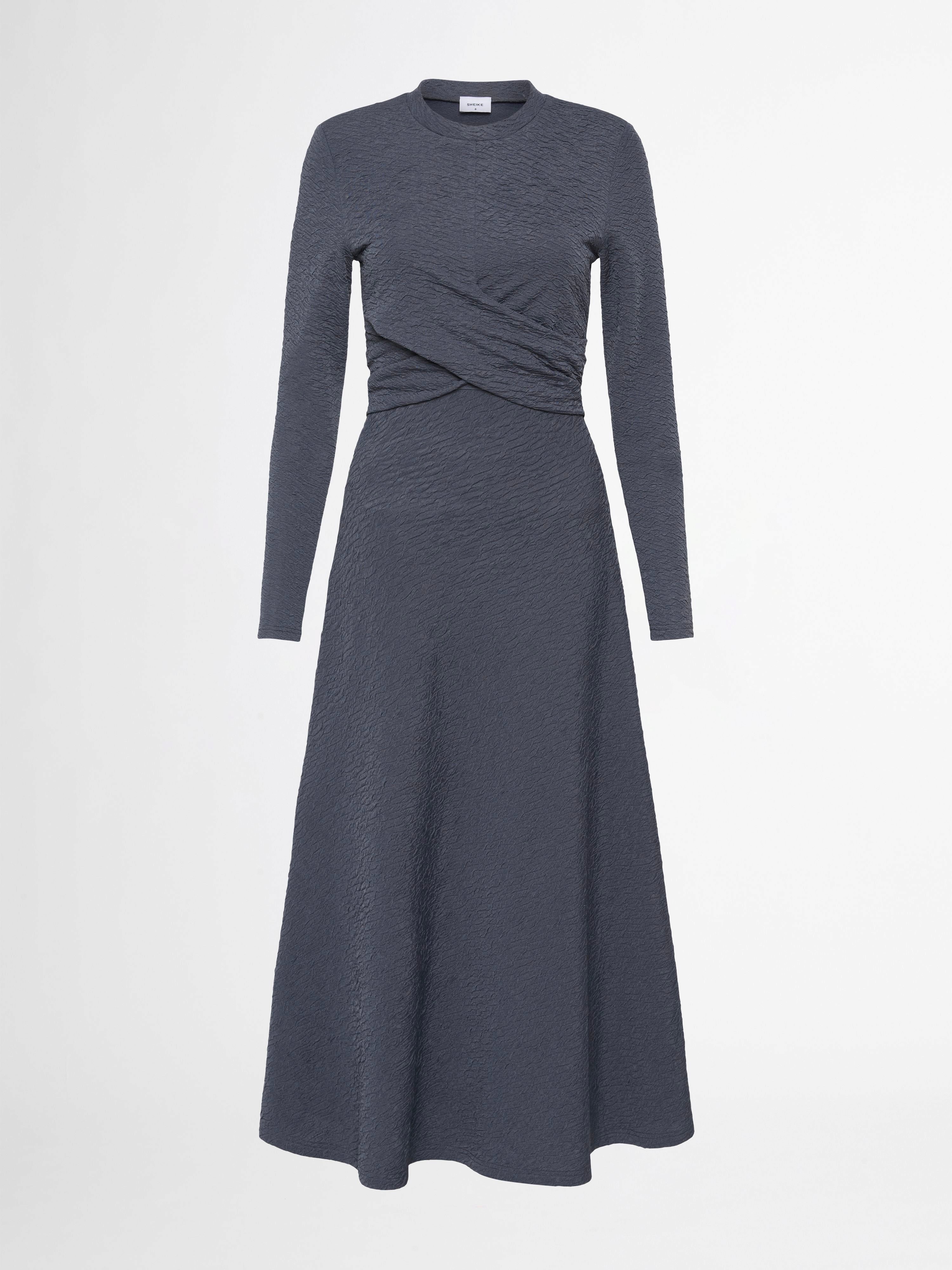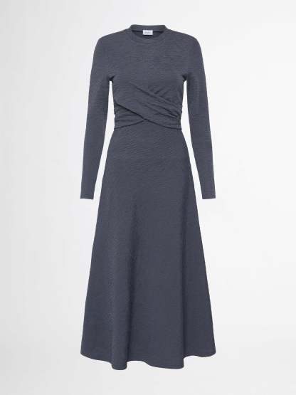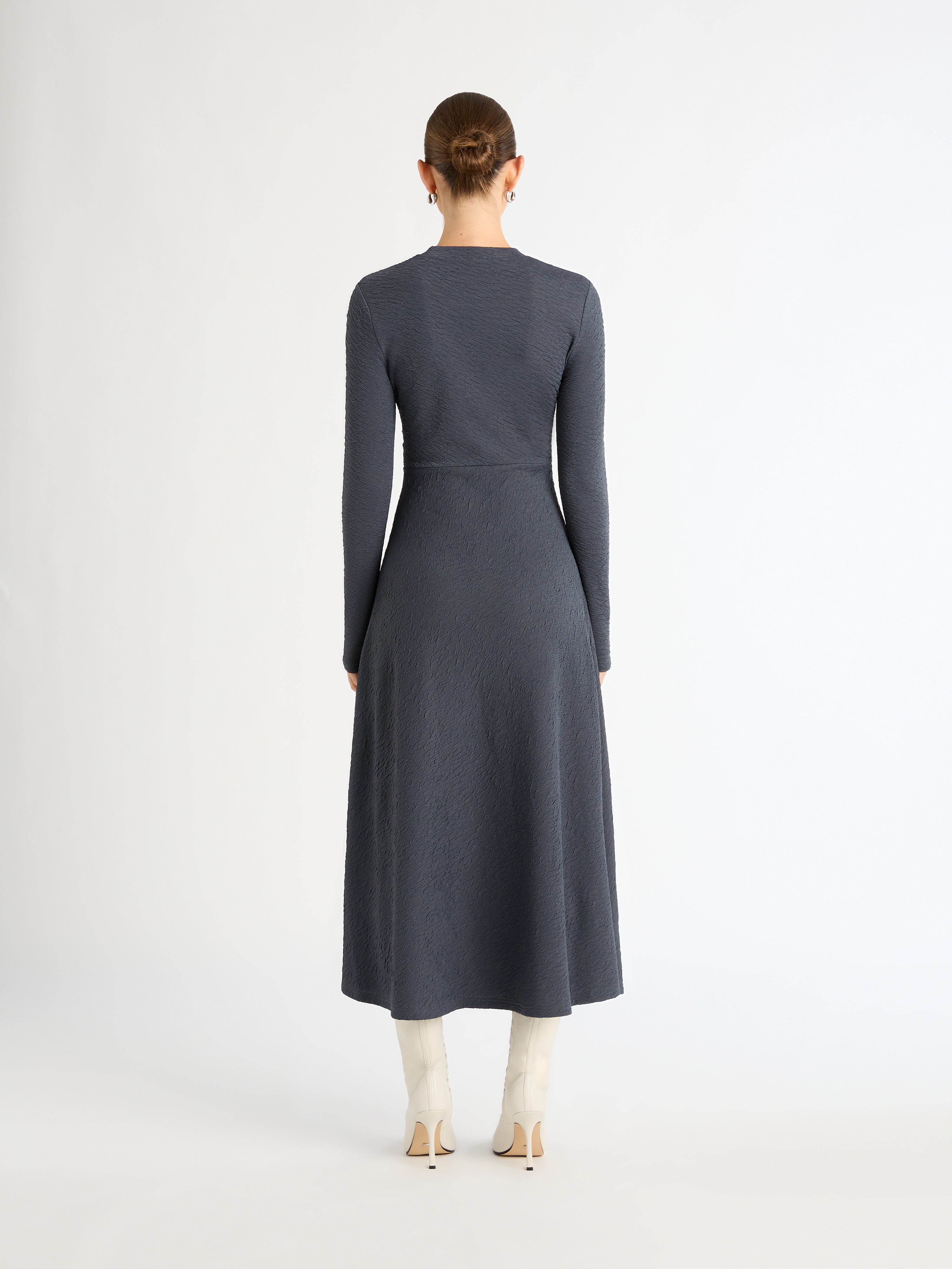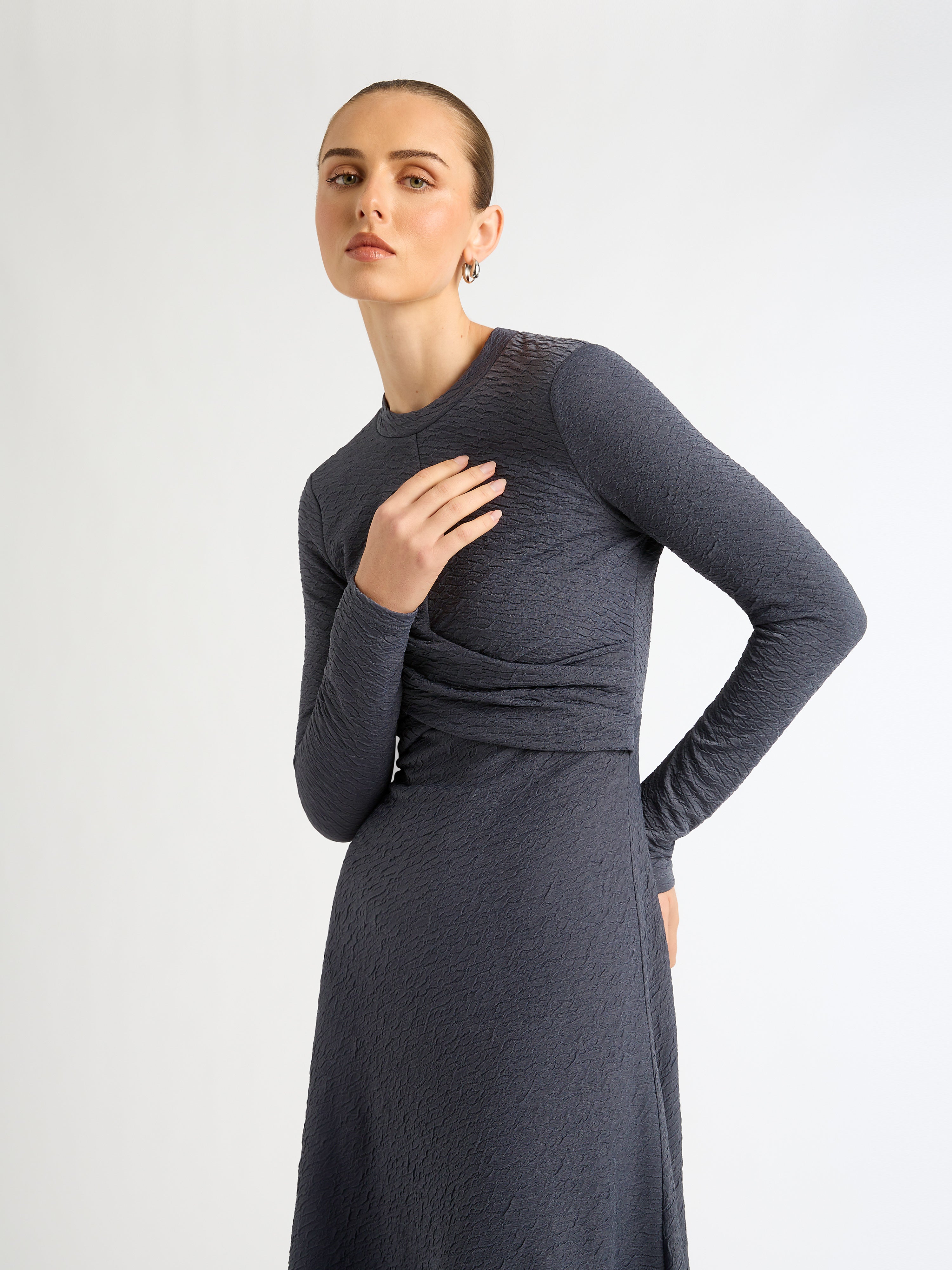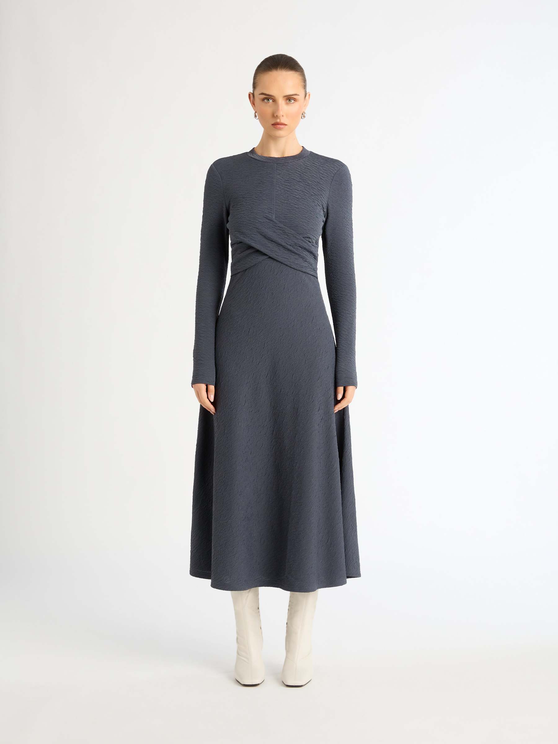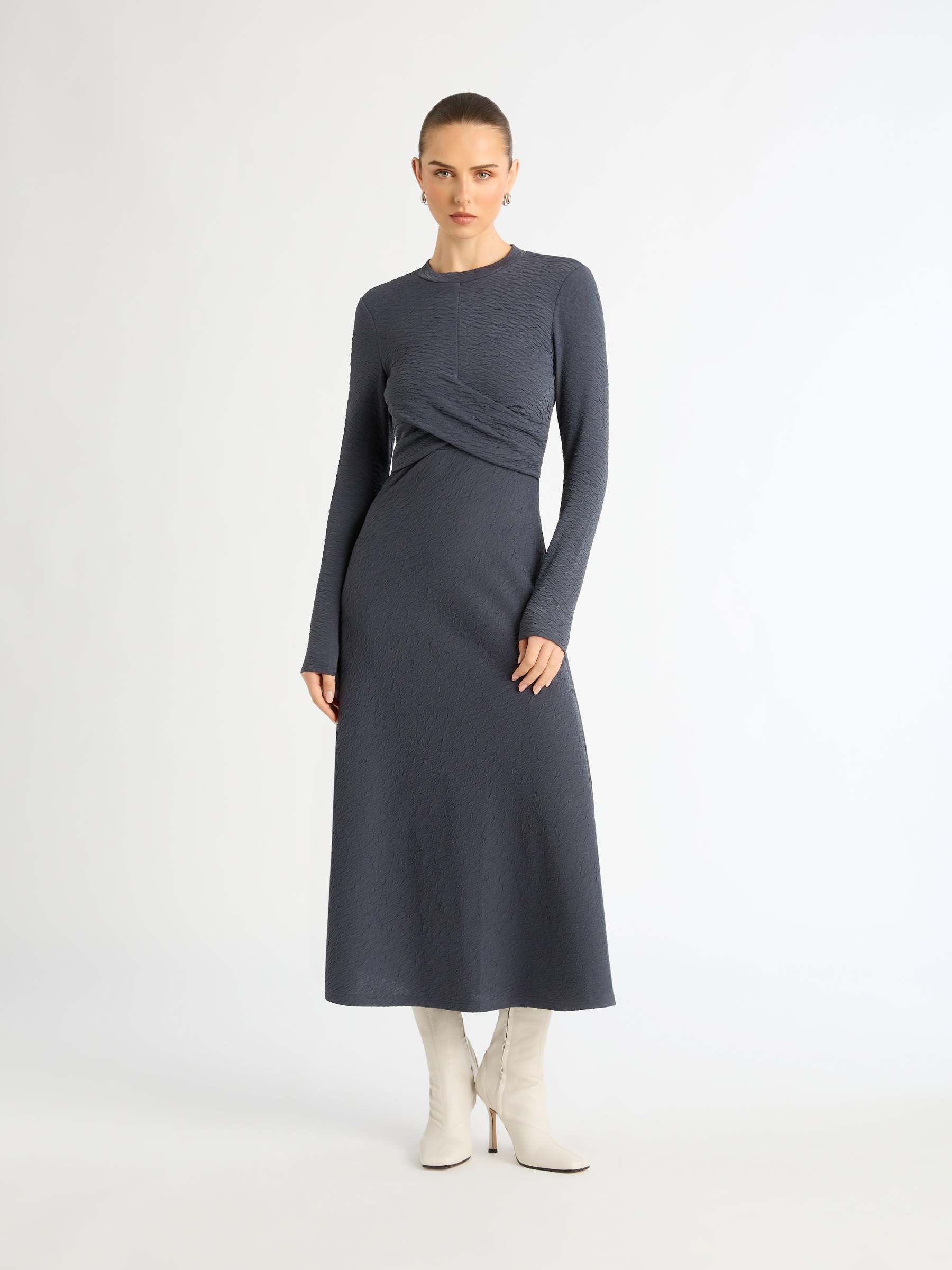 Timeless style has never been so easy! Our Surrender Midi Dress features a slate textured stretch knit fabrication, fitted body with twist front detailing at bust, high neckline, long sleeves and a killer A-line Midi length skirt. Love this look? Also available in Cream.