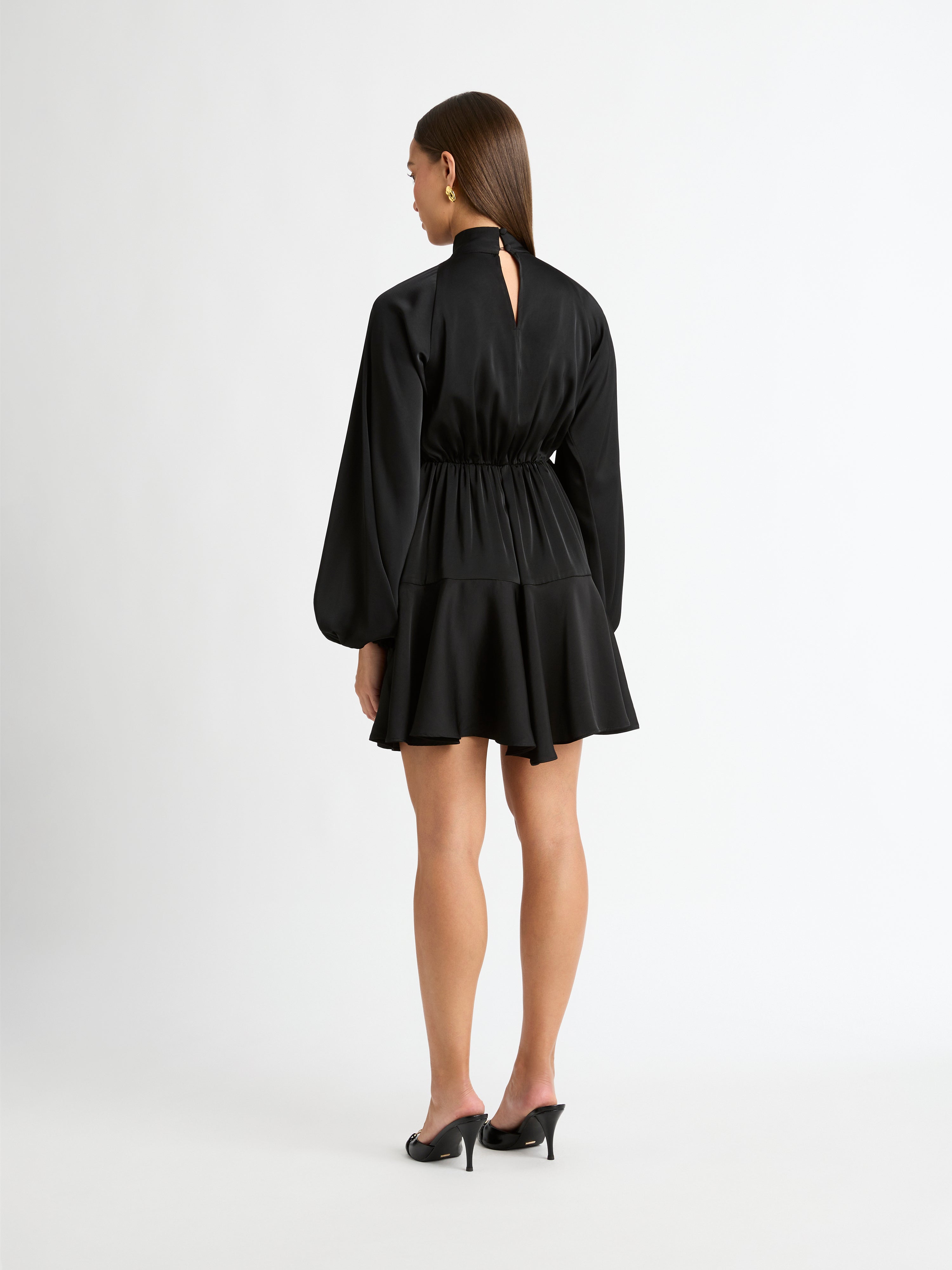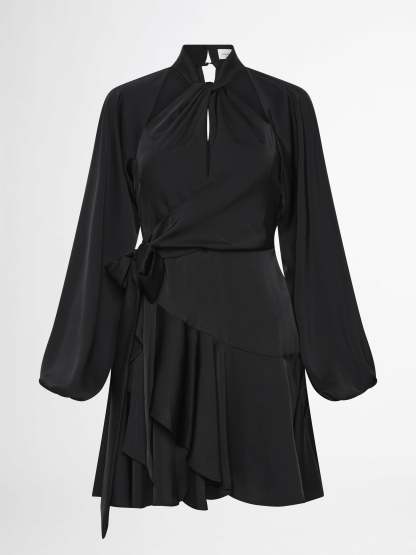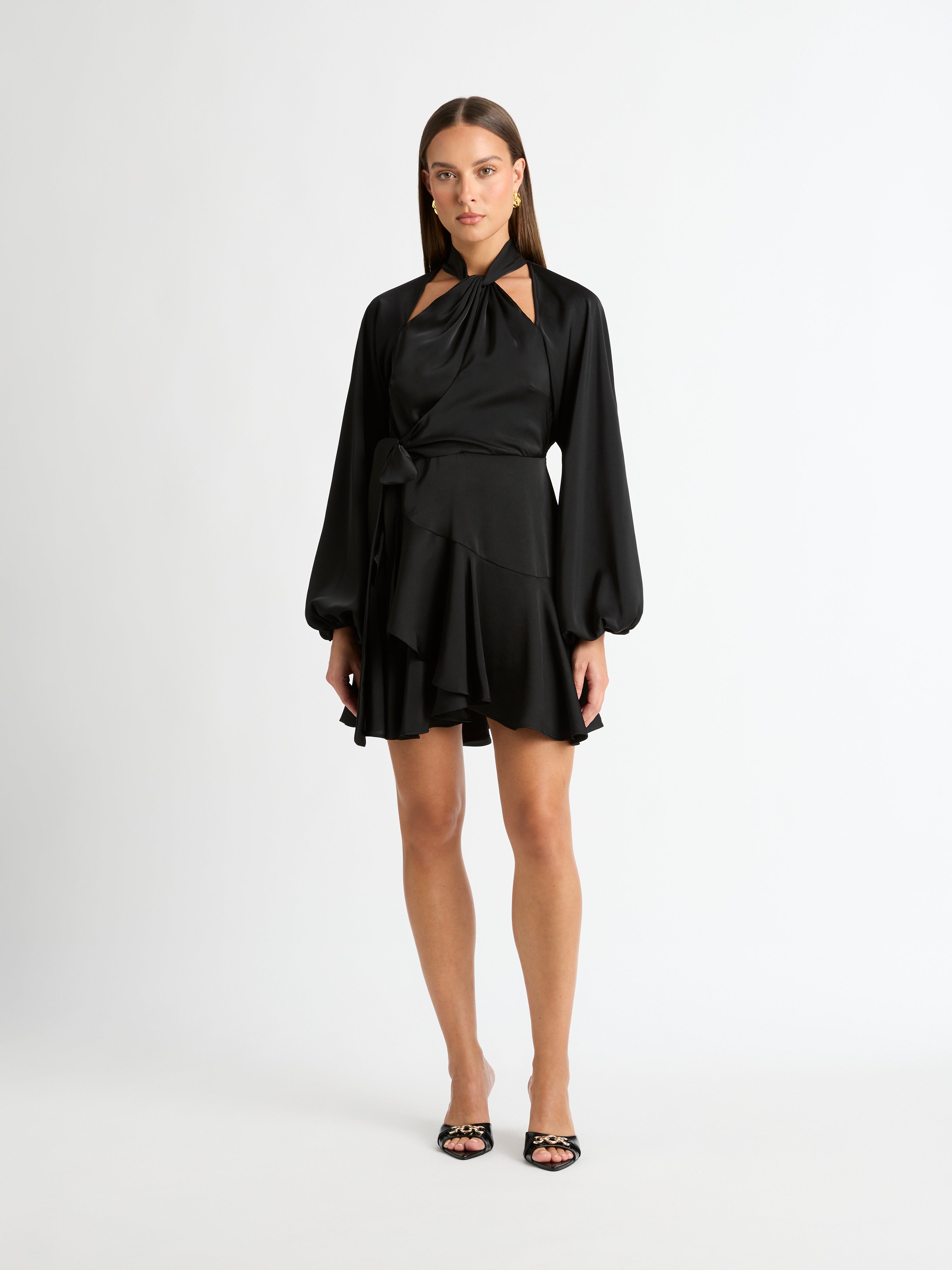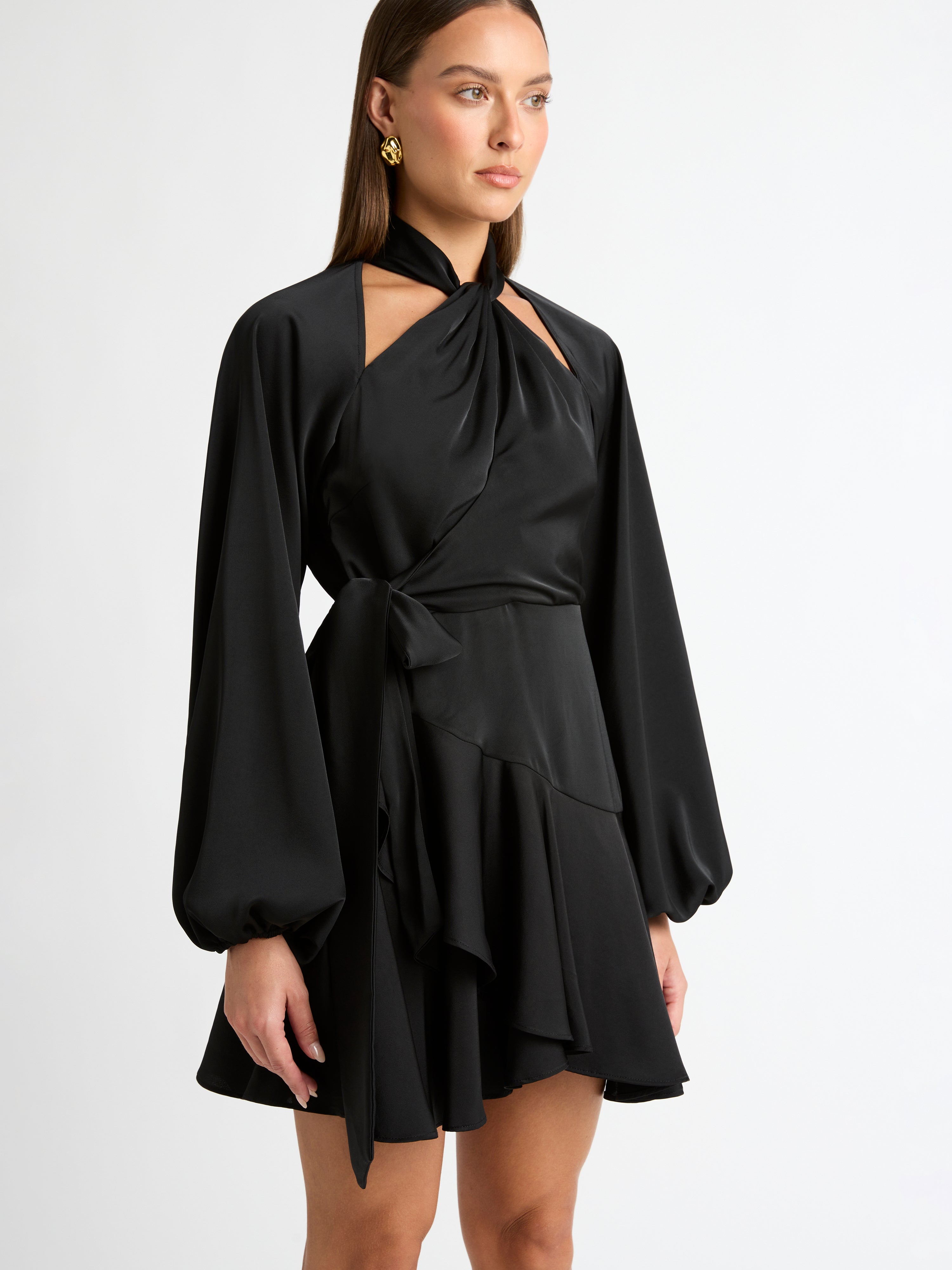 Luxe feminine styling with a timeless design. Our Thea Mini Dress is a wardrobe staple you can't go without. Featuring a satin non stretch fabrication, high neckline with cutout detailing, cross over mini skirt with side sash belt and long sleeves with elasticated cuffs. Style with our Belize Earrings to complete the look.