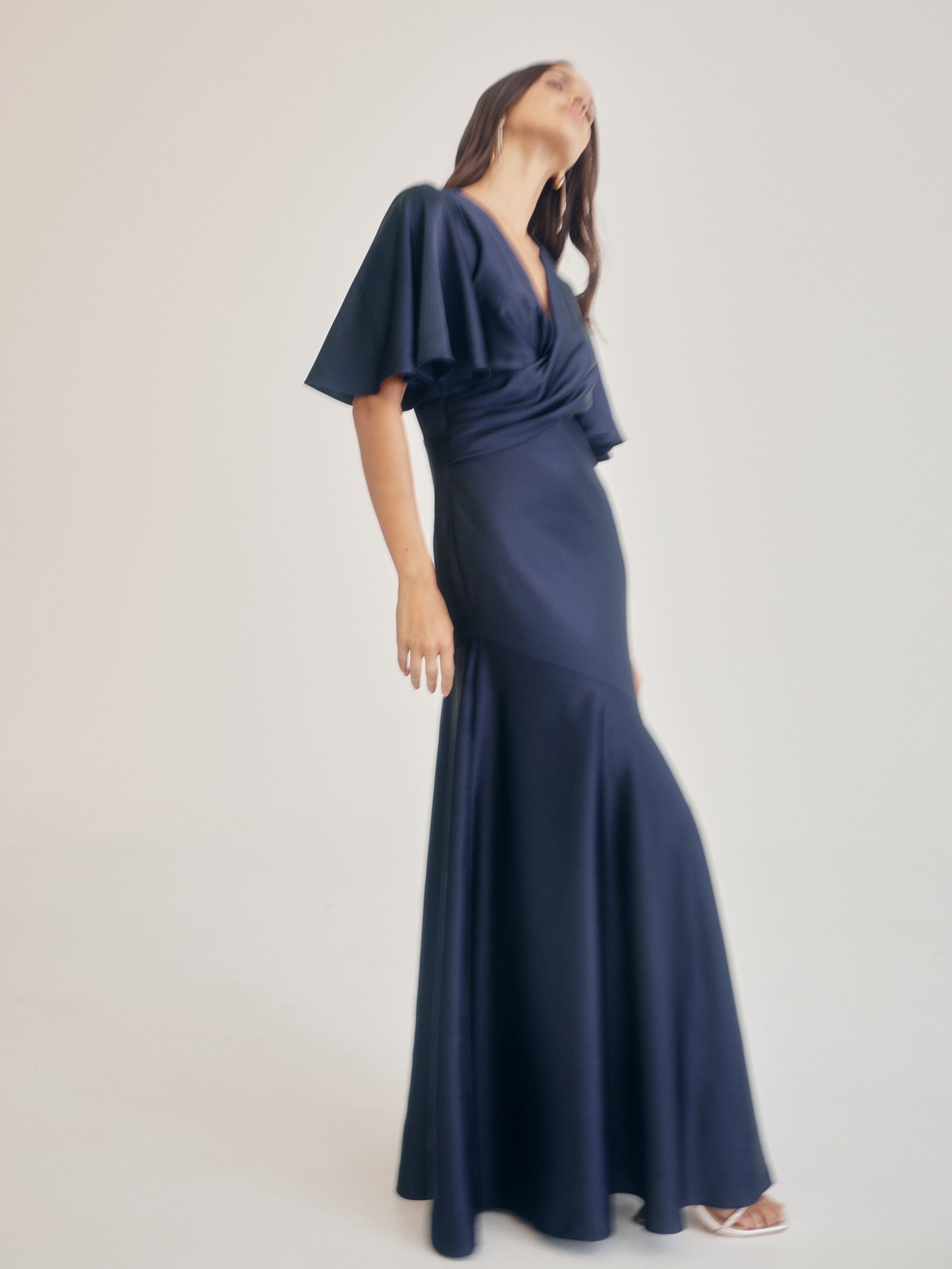 Designed to honour the shape of the female form perfectly draped and wrapped to fit. Introducing the Verona Gown - showcasing a fitted styling, V cross over neckline, bias cut maxi skirt, short bat wing style sleeve and invisible center back zipper. Pair with our Sphere Stud Earrings to complete the look.